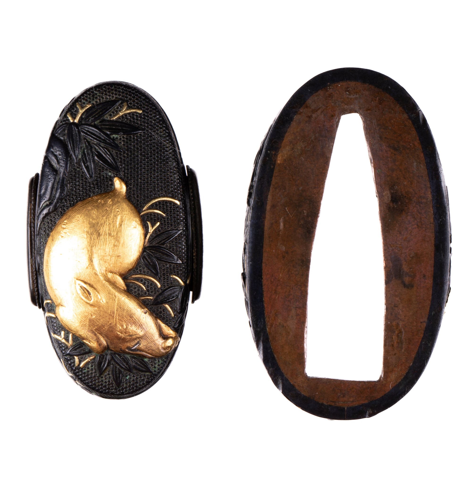 Shakudo nanako fuchikashira decorated with boars under crescent moon.