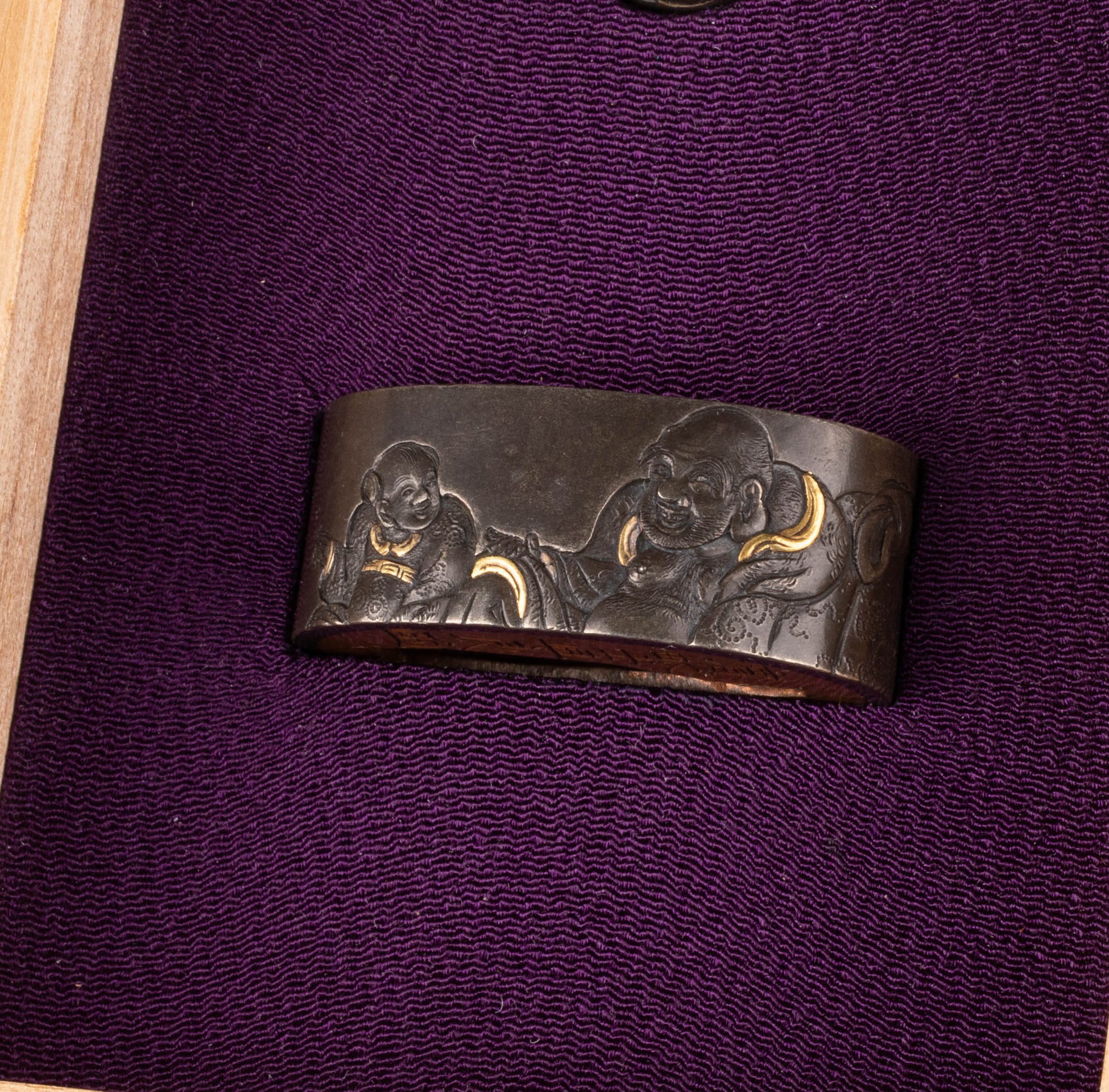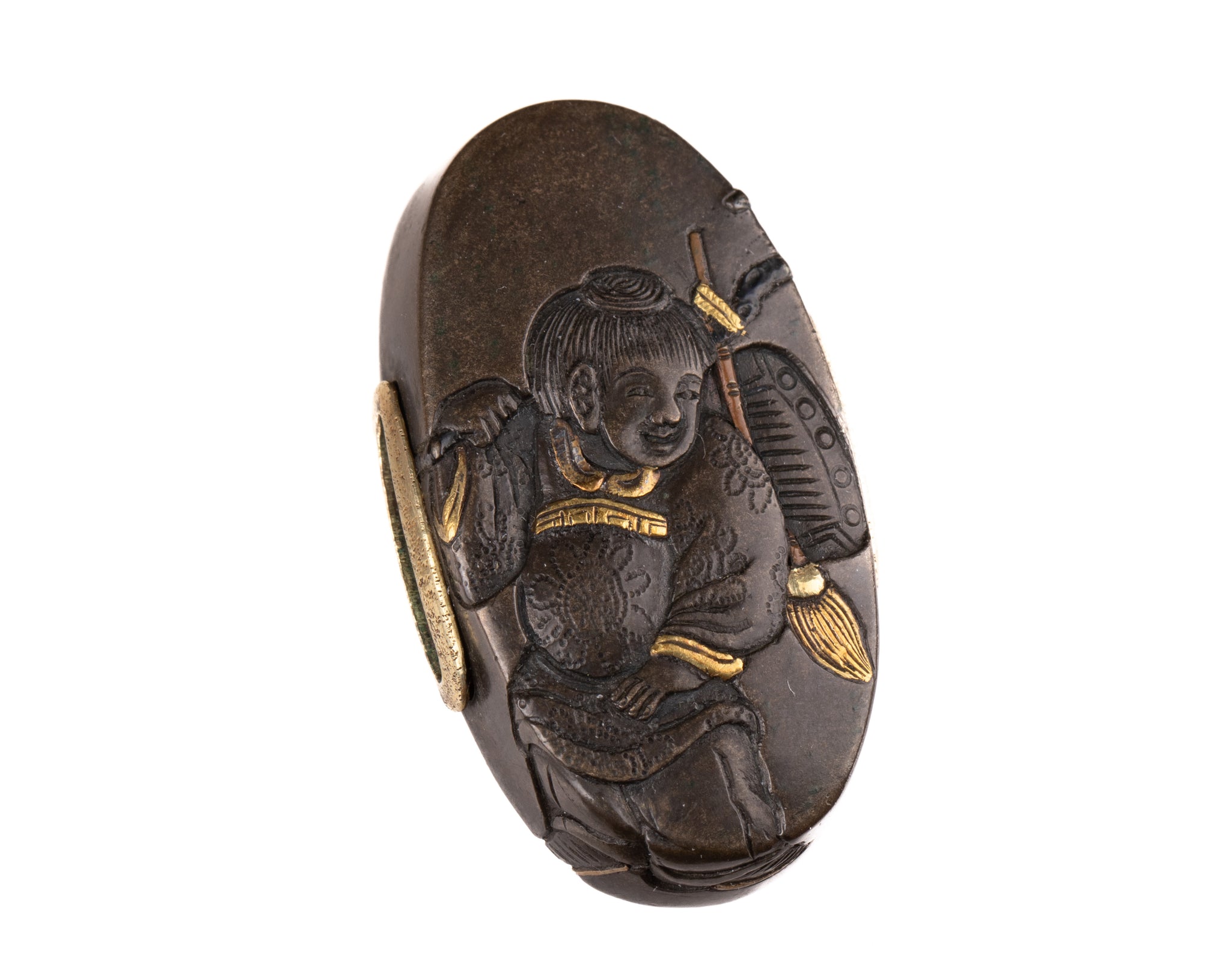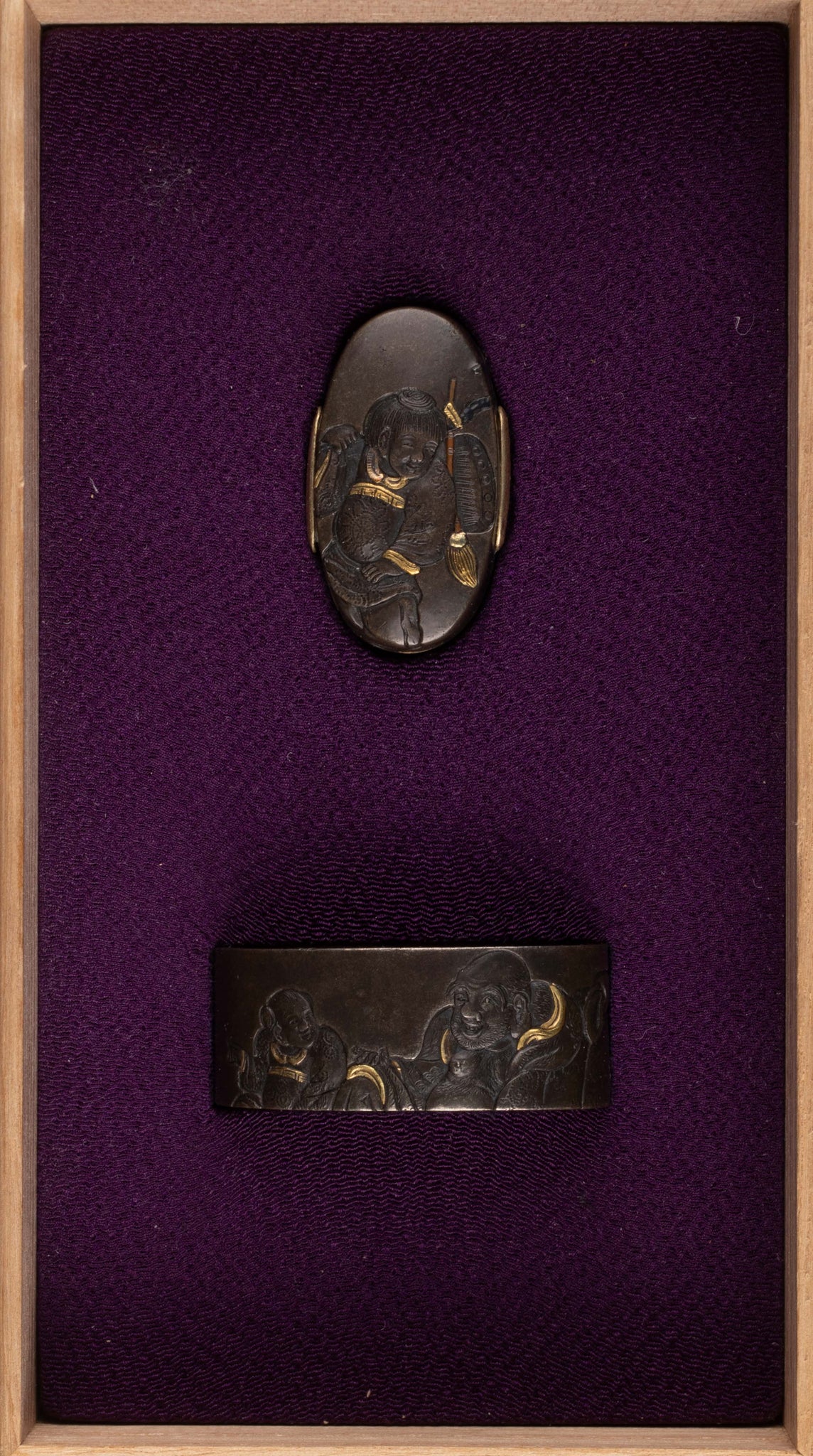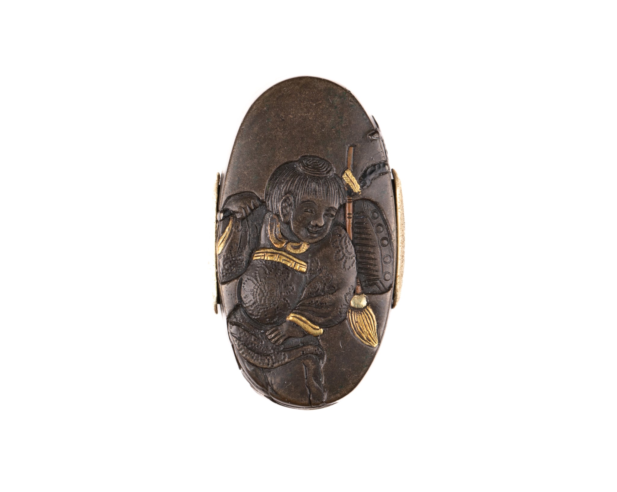 Made of polished ground shibuichi with gold and shakudo iroe.