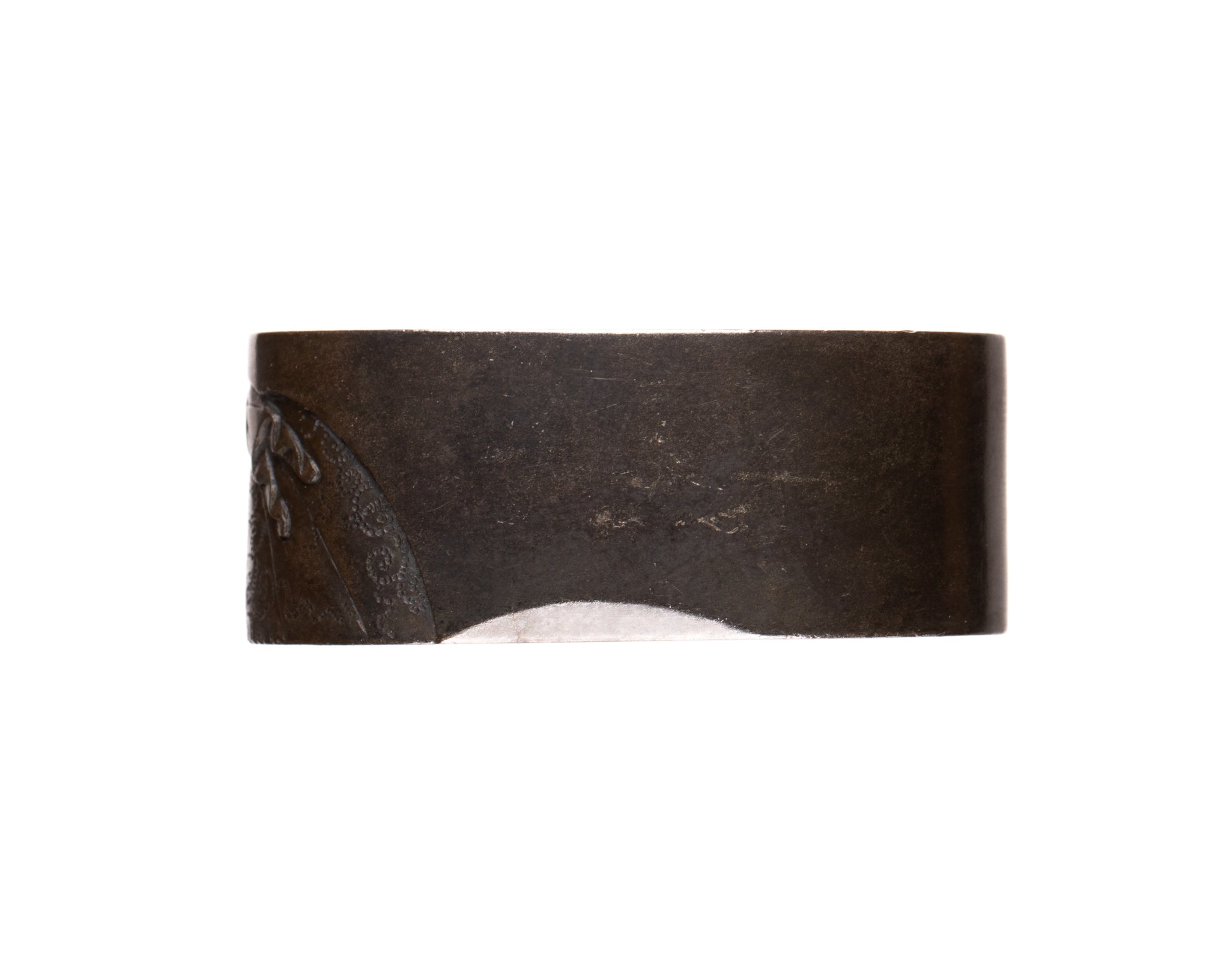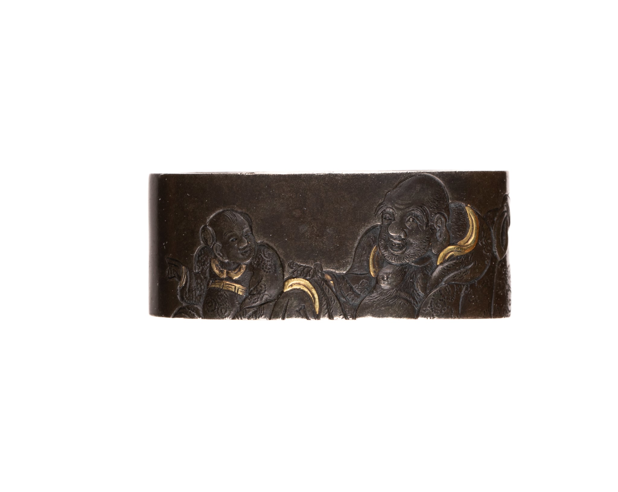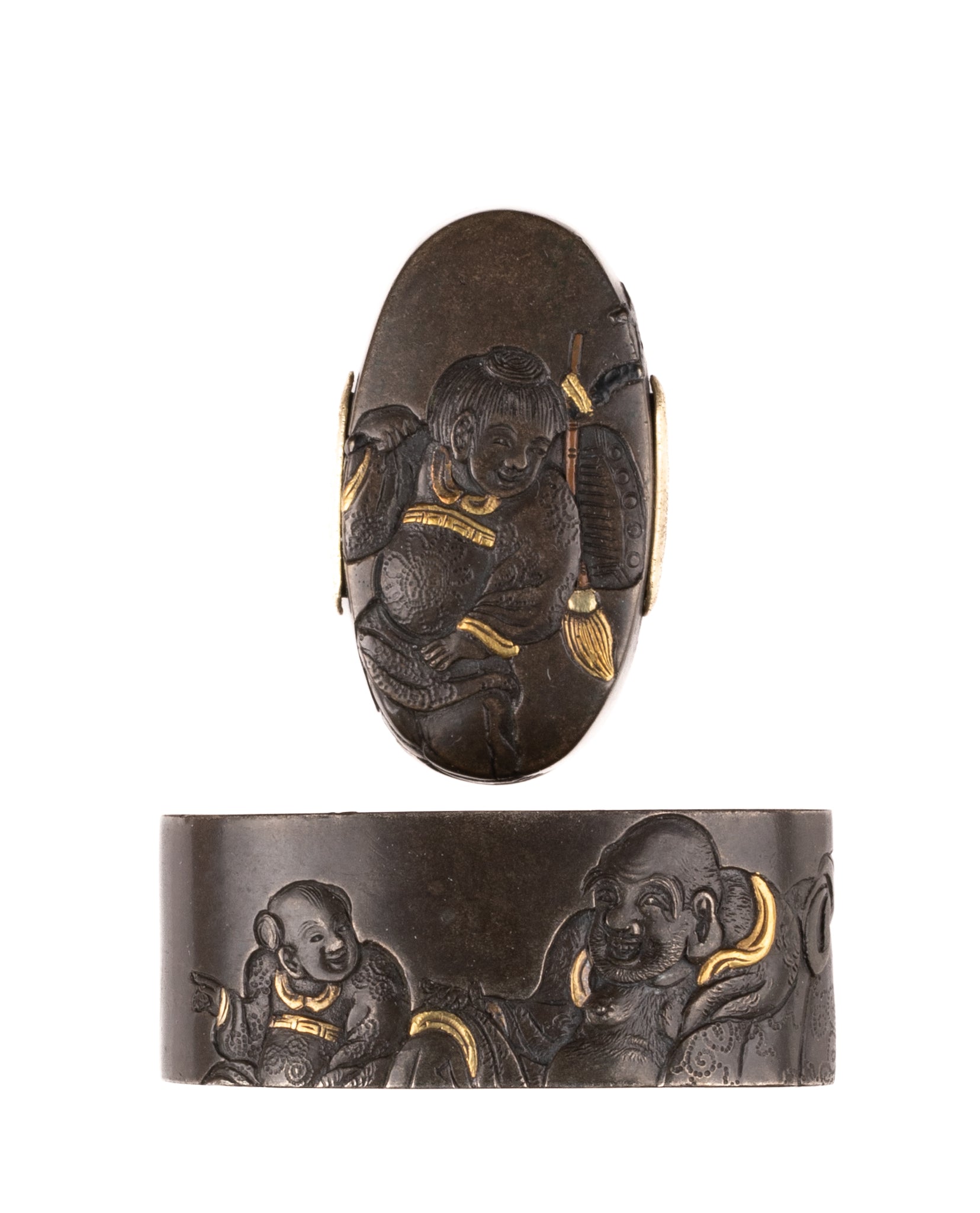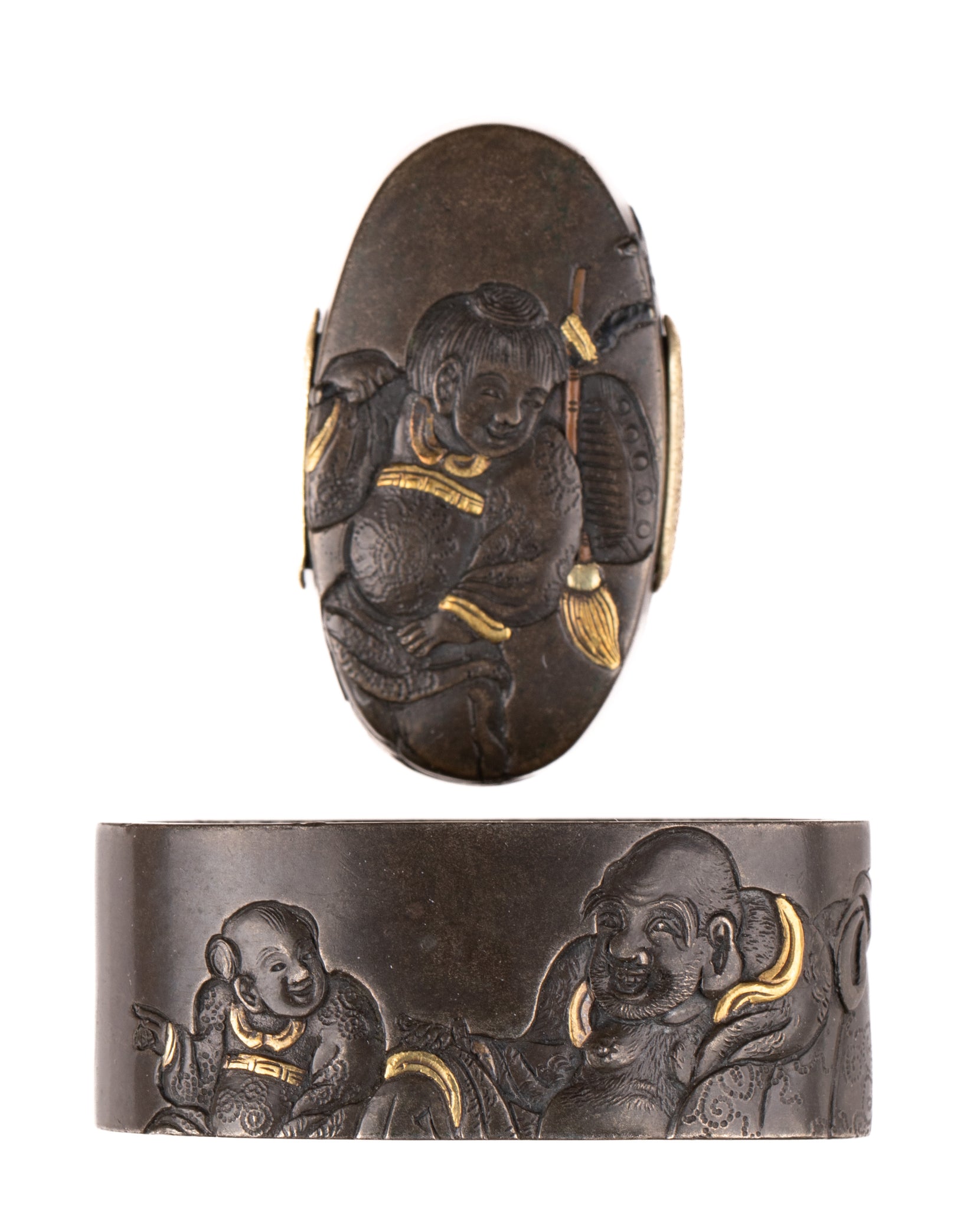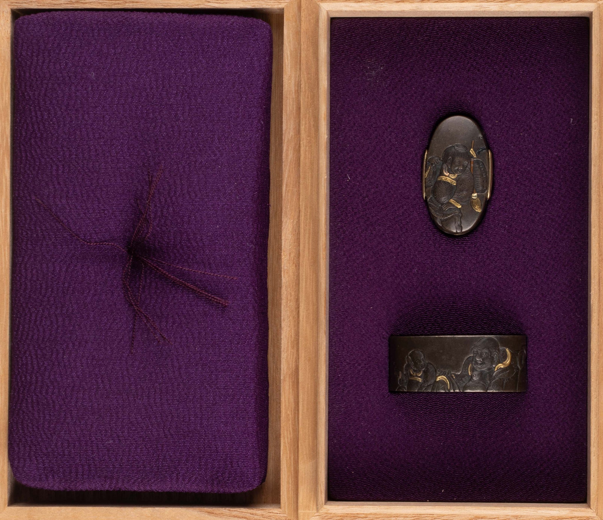 Made of polished ground shibuichi with gold and shakudo iroe.