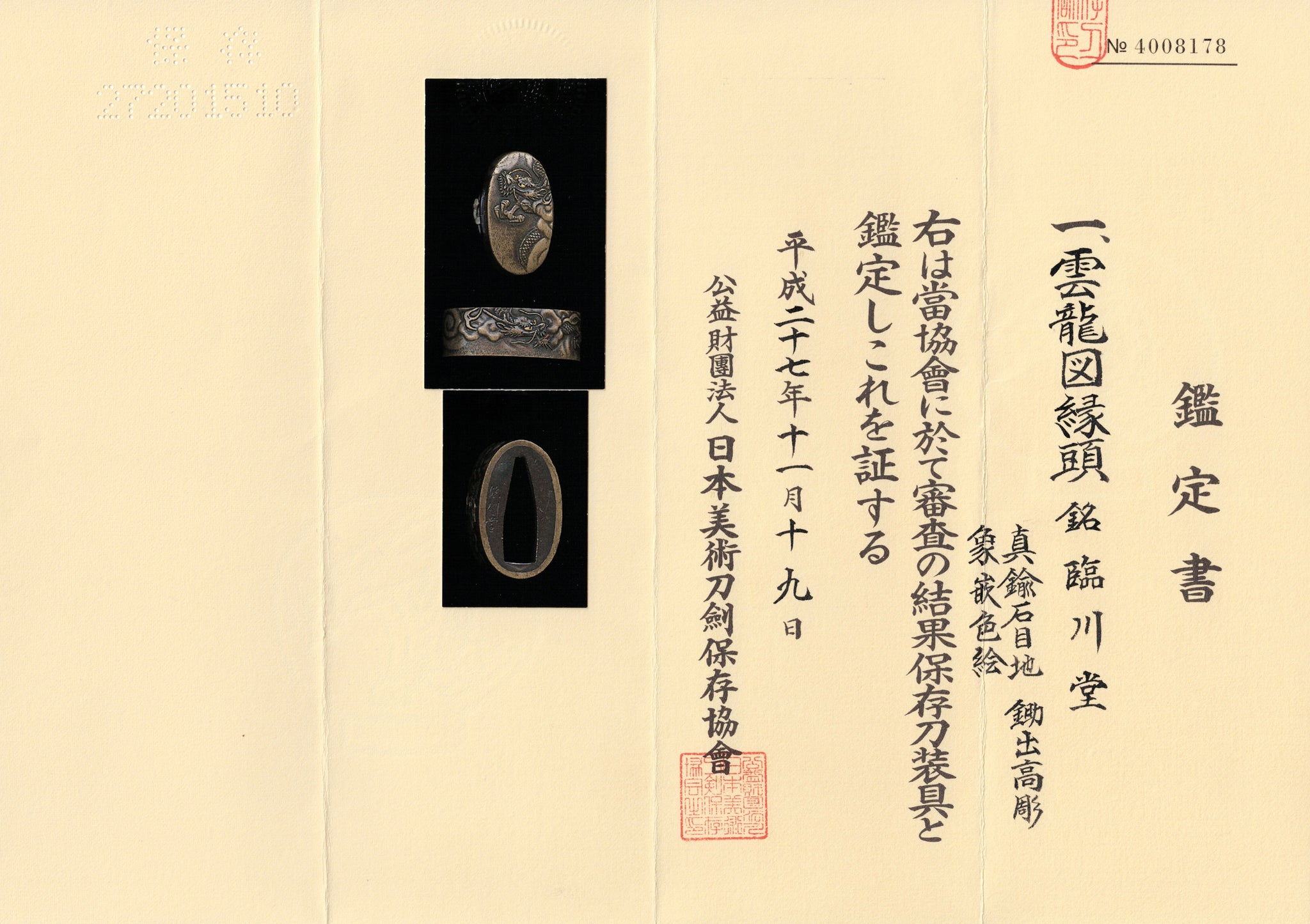 Fuchikashira signed "Rinsendo" with NBTHK Hozon Tosogu. Most famous craftsman using this go was Rinsendo Mitsumasa born in the 1721. However I have checked this signature against Mitsumasa piece I own and other available sources and it is written in a different way. Therefore I suspect that this piece could have been made by his adopted son who signed "Rinsendo Mitsuo". Unfortunately I was not able to find any examples of his signature for comparison. Therefore it reacquires further study to figure out who exactly made it.