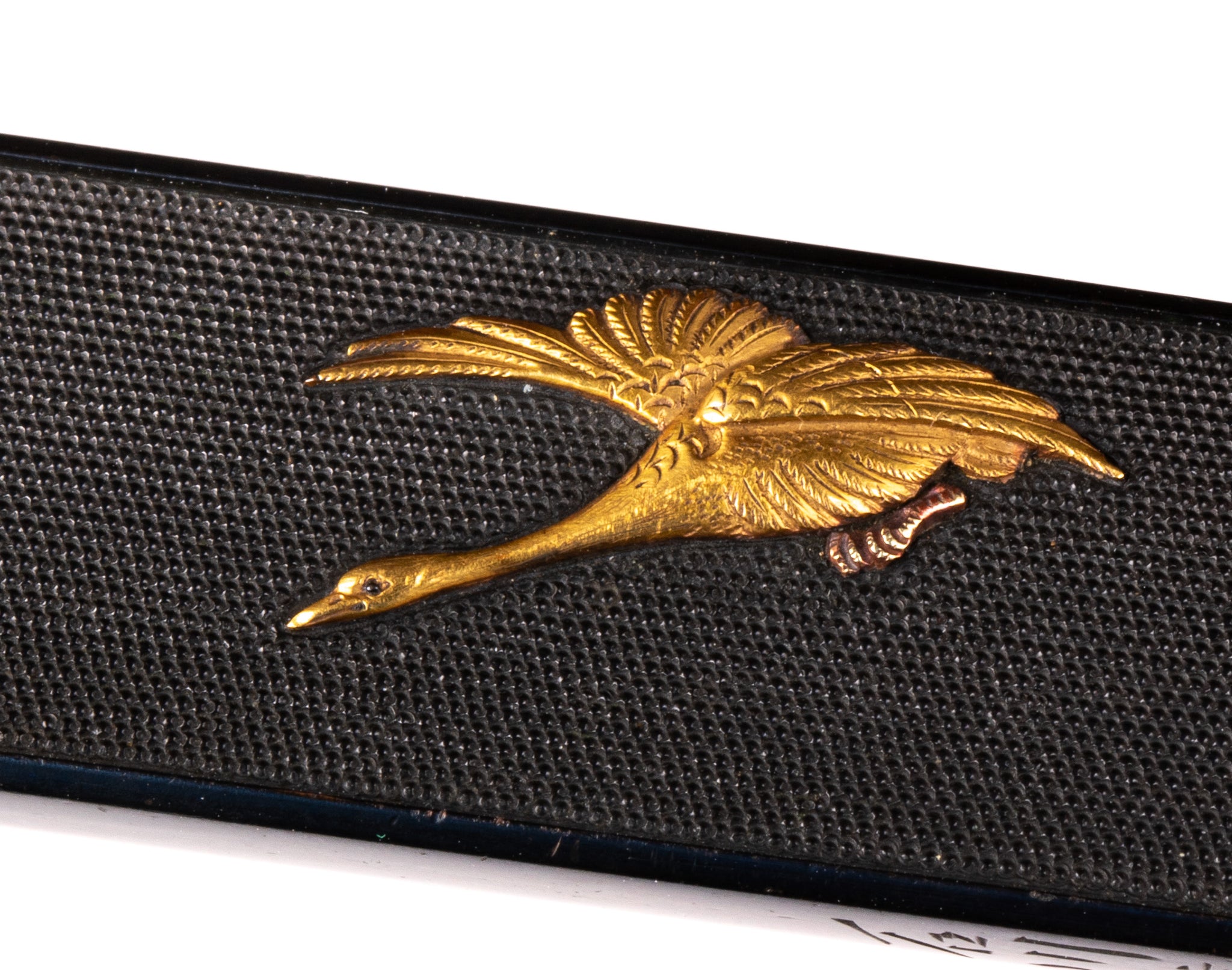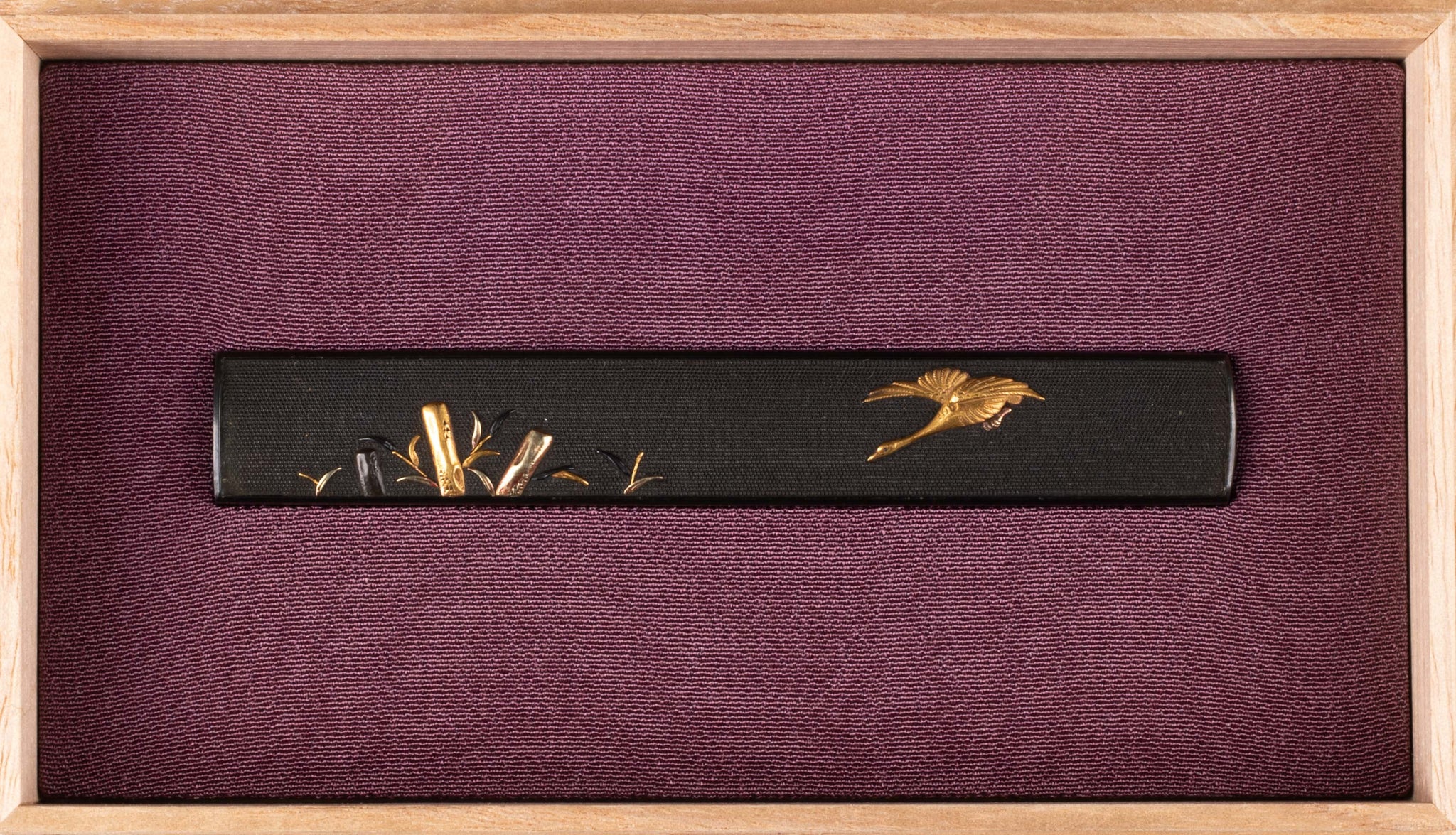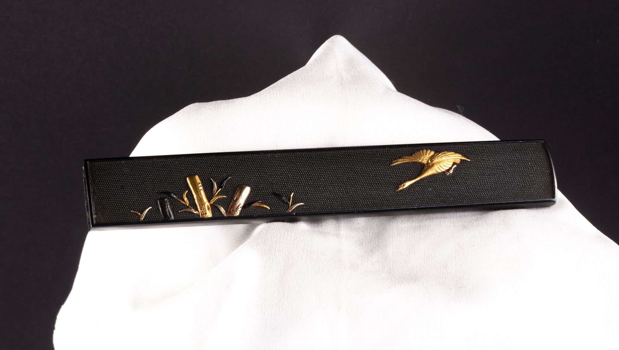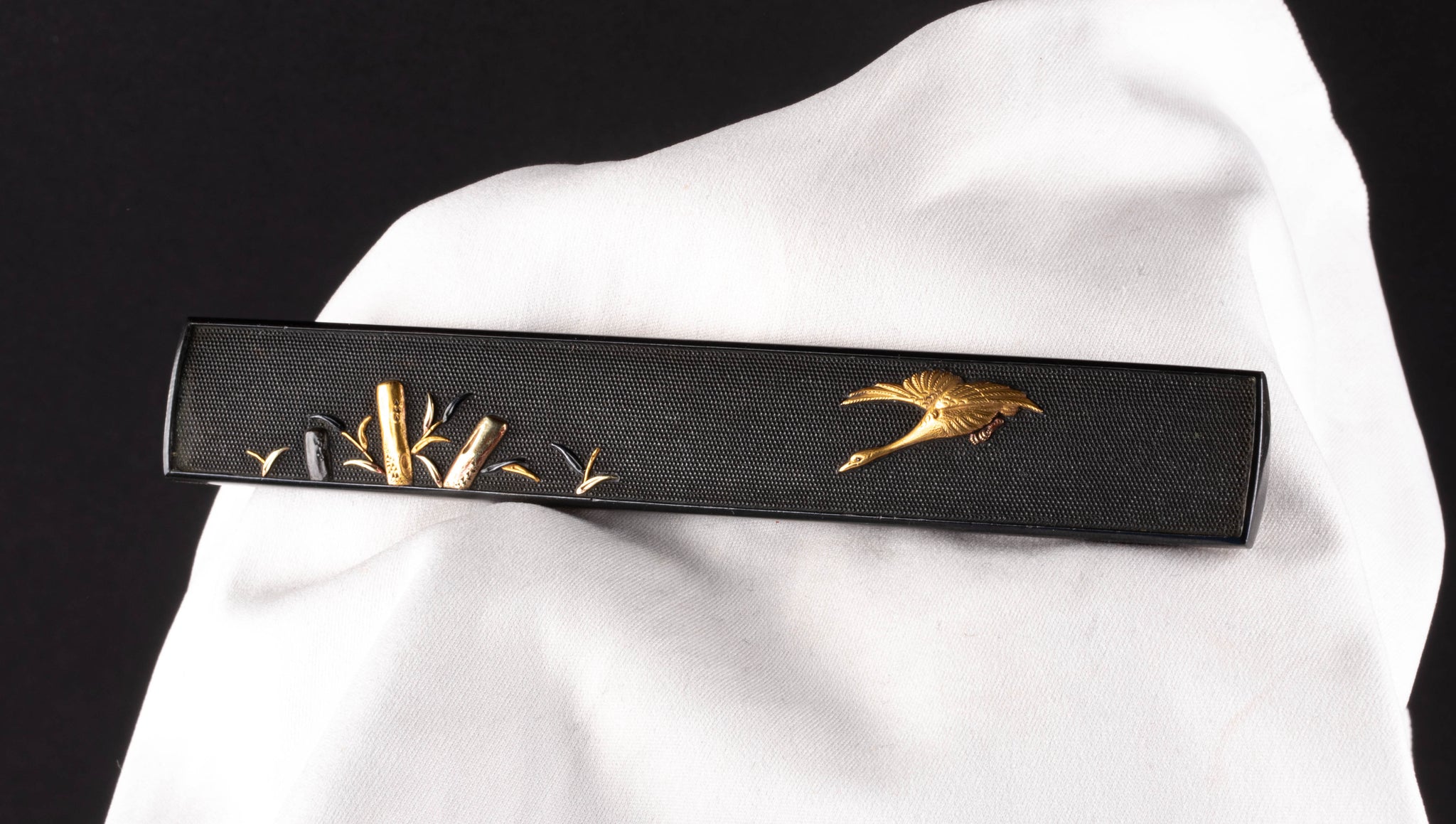It is made of very high quality shakudo with great nanako. Wild geese is covered with thick layer of gold foil and decorated with shakudo eye. Tree trunks and leafs are very well executed. Design is elegant and simplistic. This is really a great piece to appreciate.