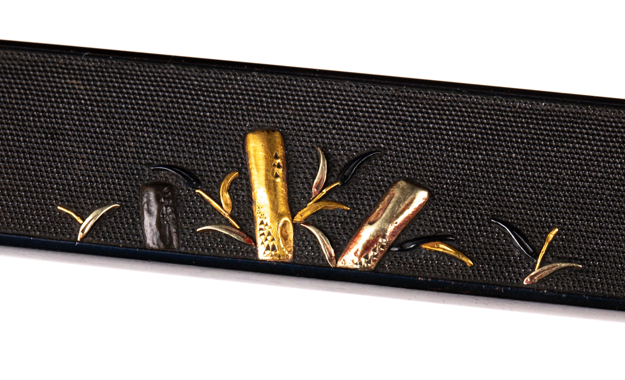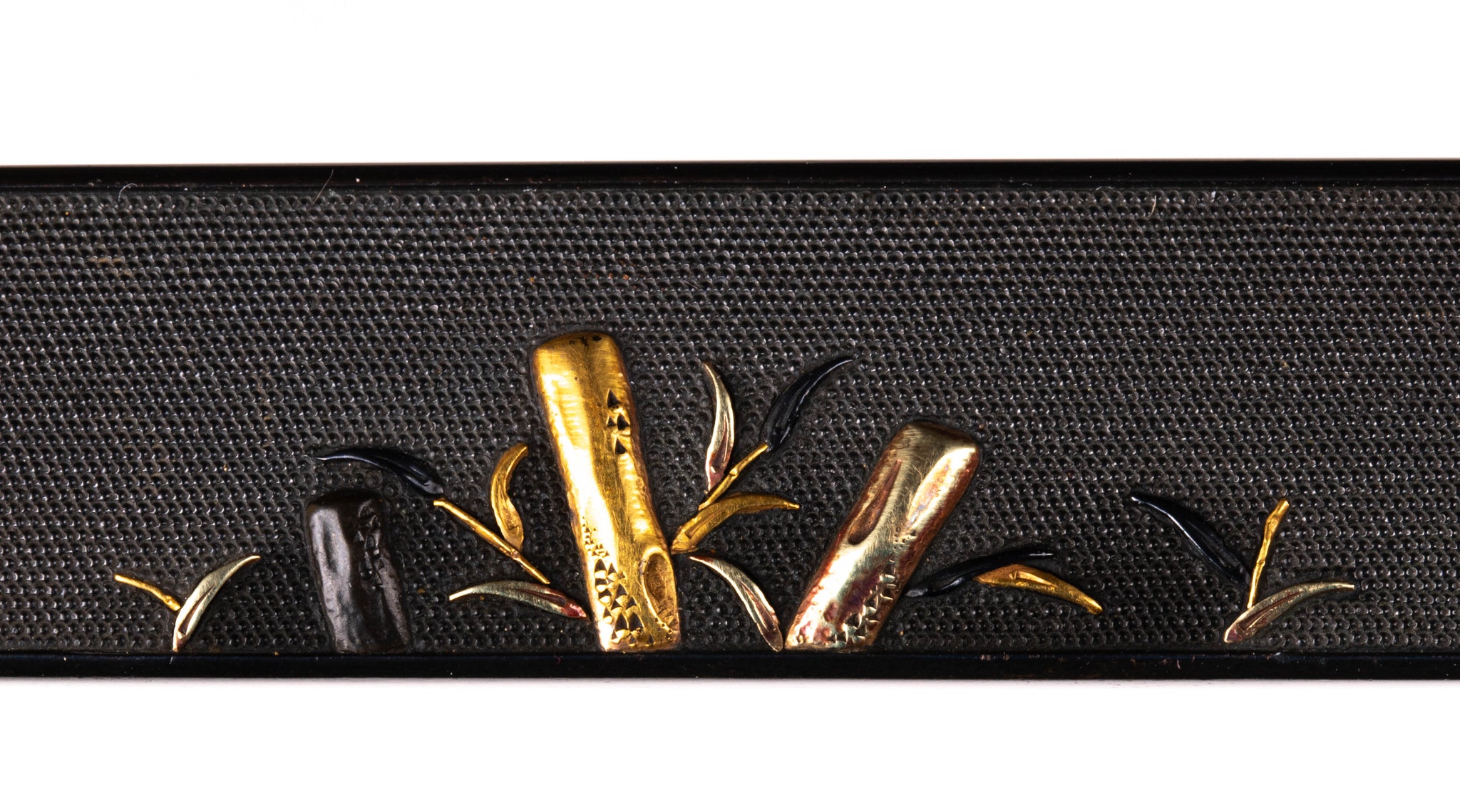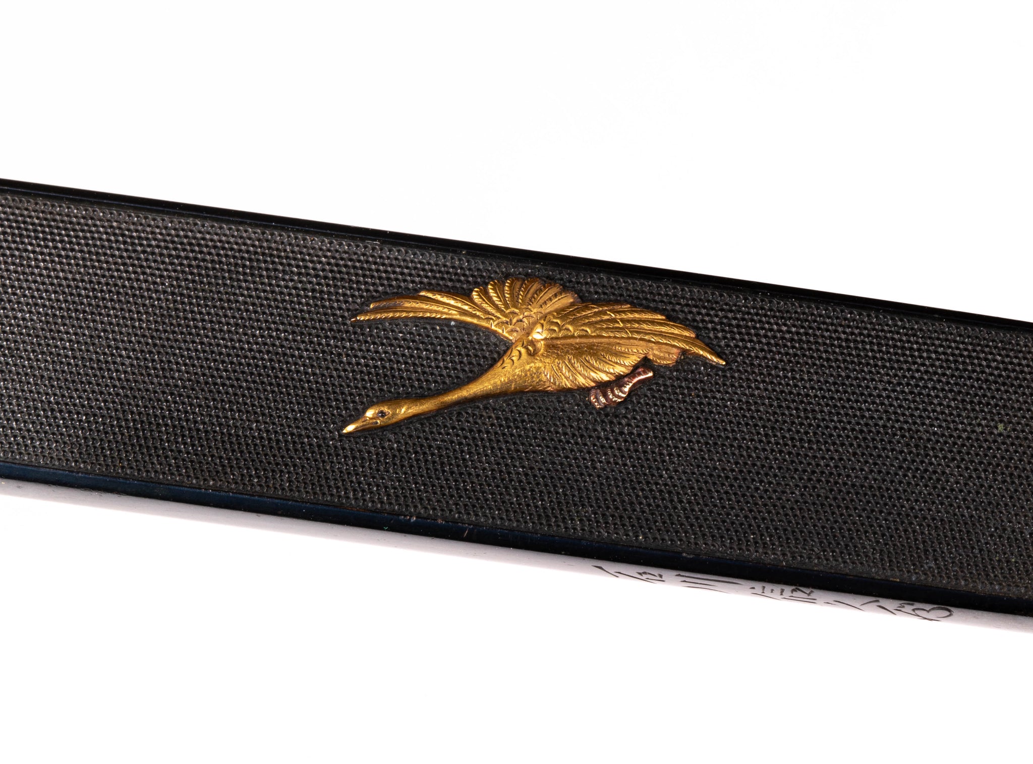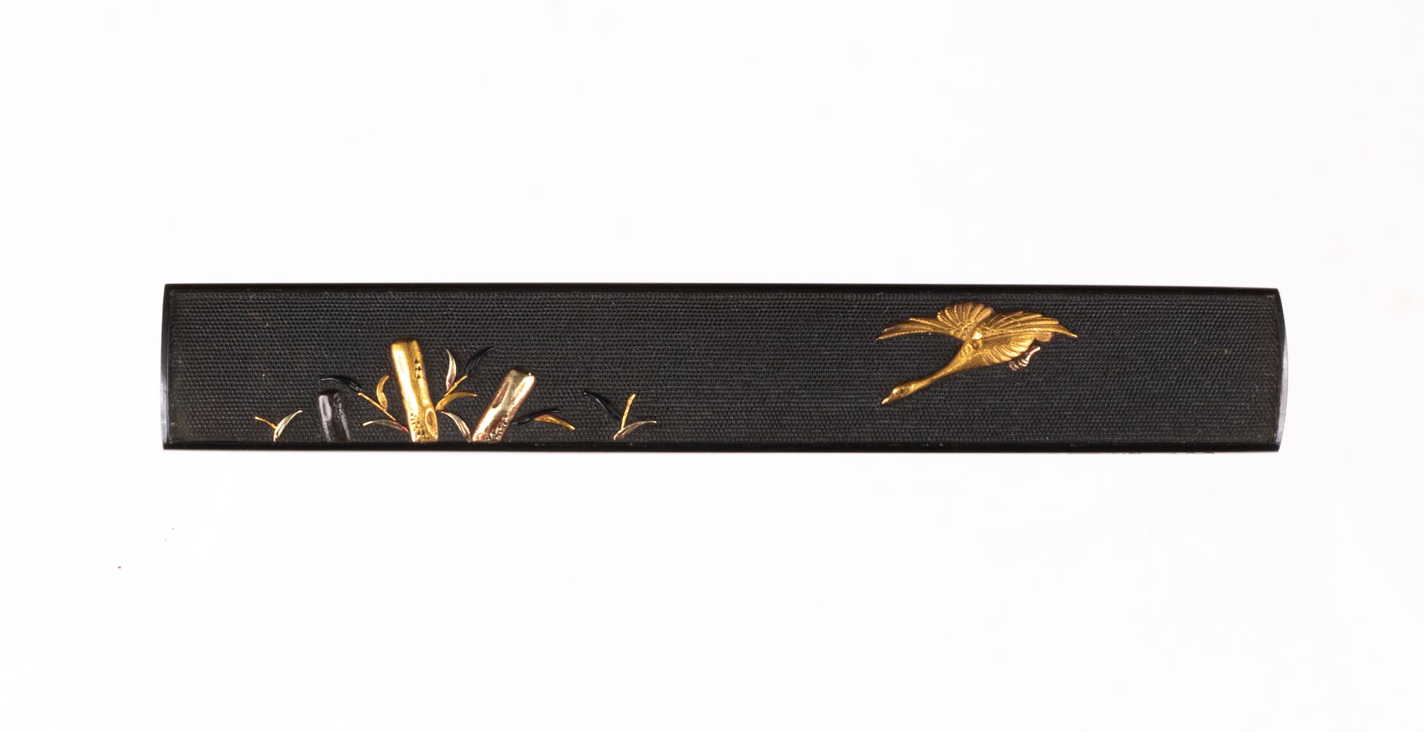 It is made of very high quality shakudo with great nanako. Wild geese is covered with thick layer of gold foil and decorated with shakudo eye. Tree trunks and leafs are very well executed. Design is elegant and simplistic. This is really a great piece to appreciate.