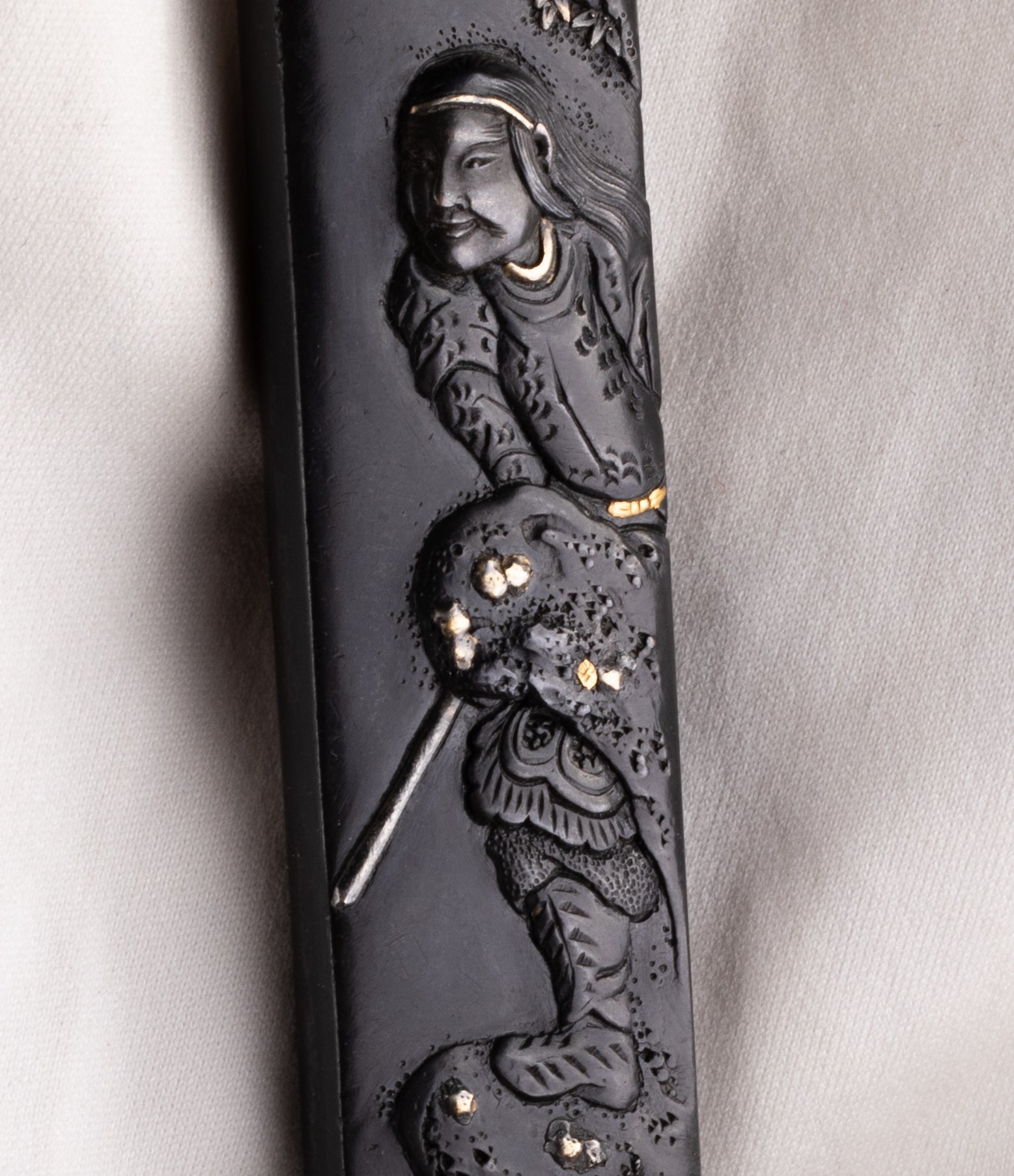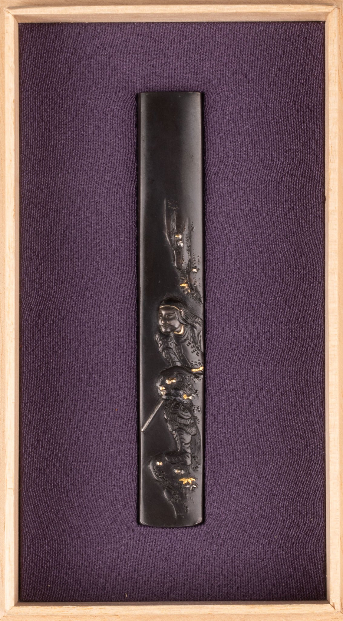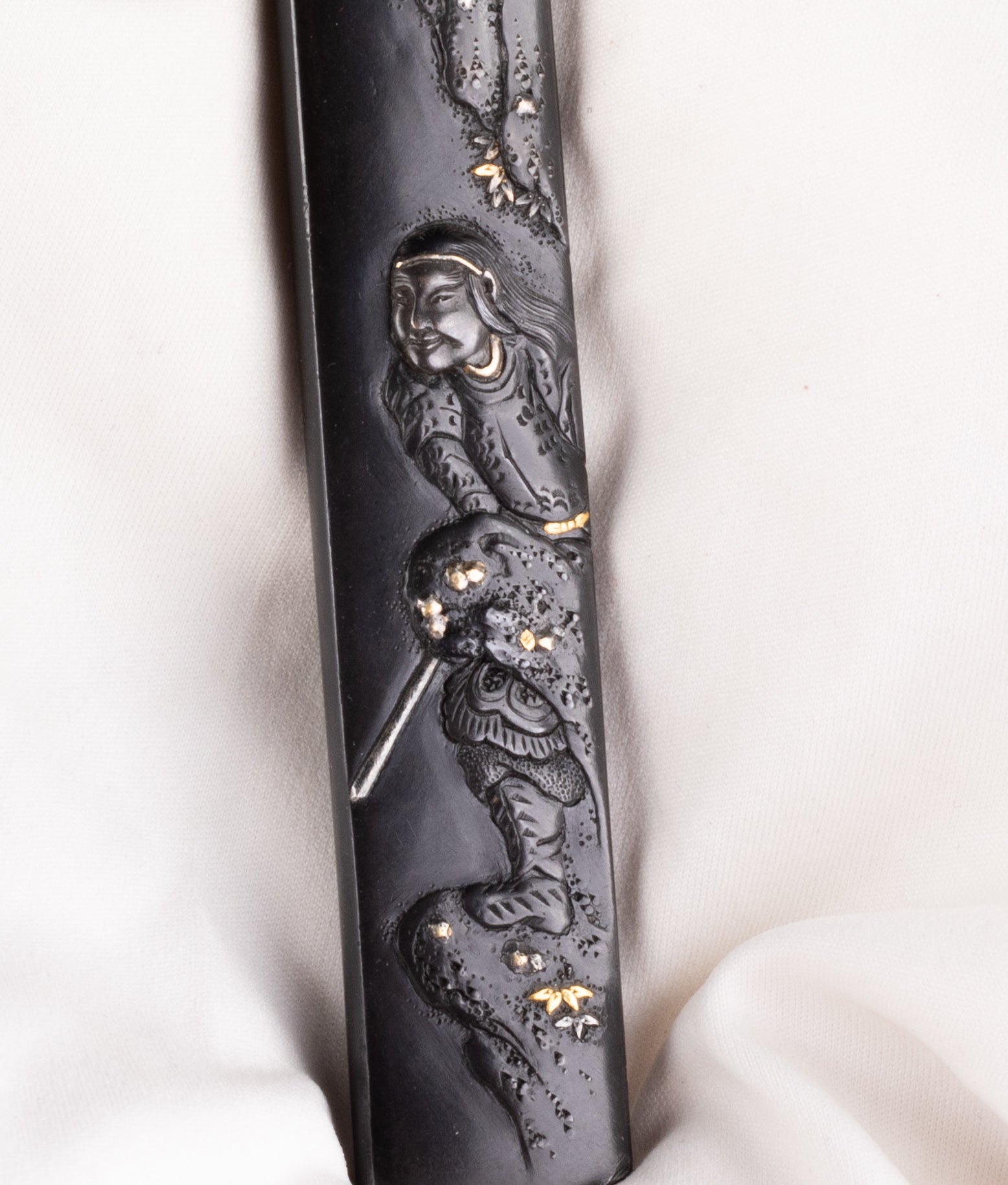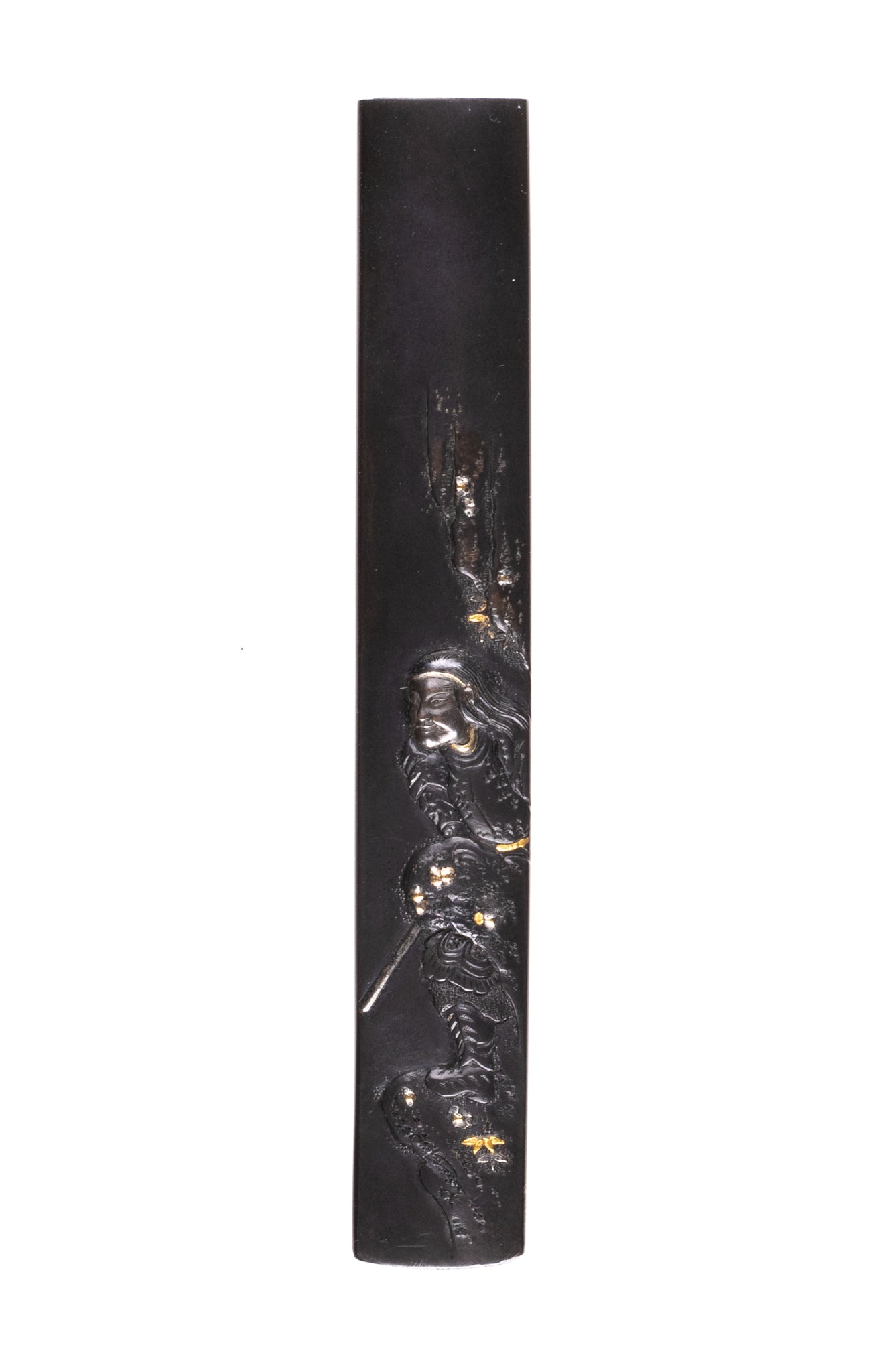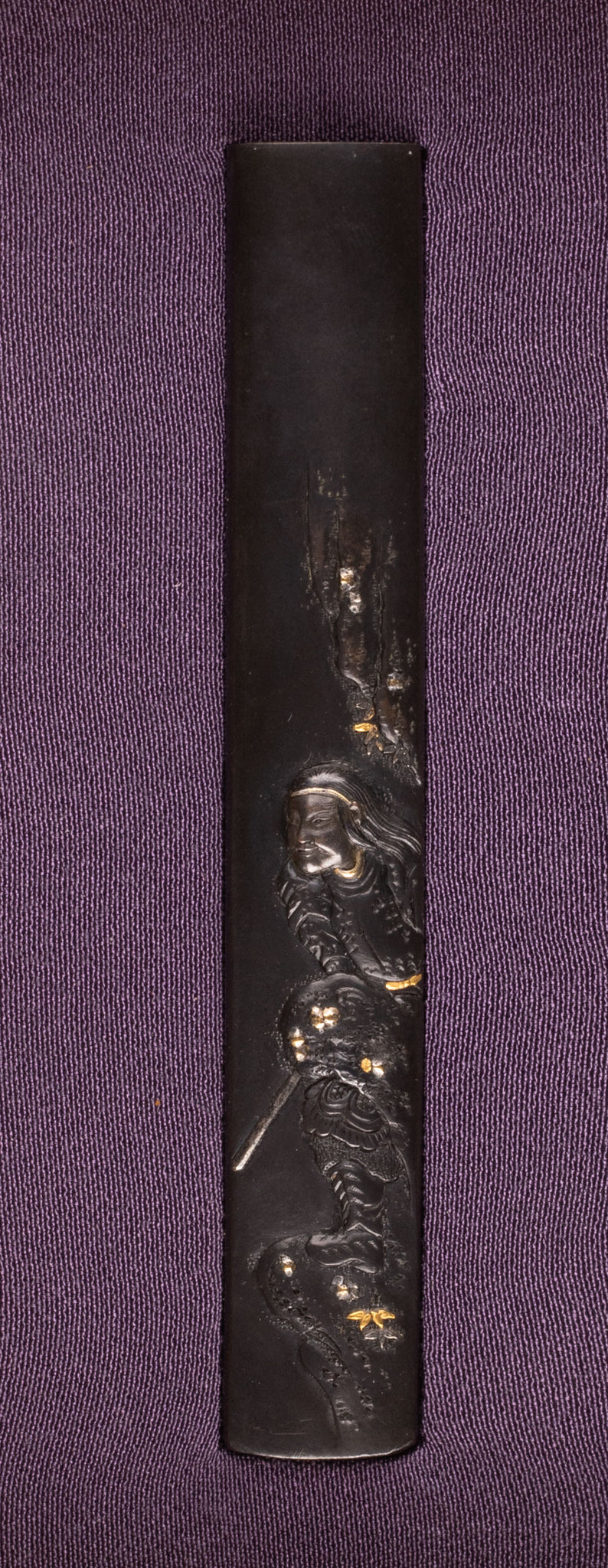 Decorated with a motif of Prince Yamato Takeru. He was a semi-legendary prince from the Japanese imperial family, born around 72 AD. There are many fascinating stories about his life. The most important of these may concern the sword he holds on this kozuka. It is the "Kusanagi No Tsurugi," a sword extracted from the body of an eight-headed beast by the god Susanoo and subsequently given to the goddess Amaterasu. This sword rested at the Amaterasu Shrine in Ise until it was presented to Prince Takeru. The sword itself has played a role in many important events in Japanese history. It is currently one of the three imperial regalia known as the Three Sacred Treasures.