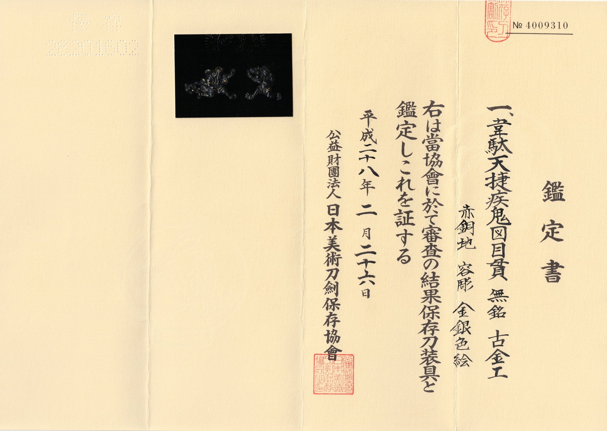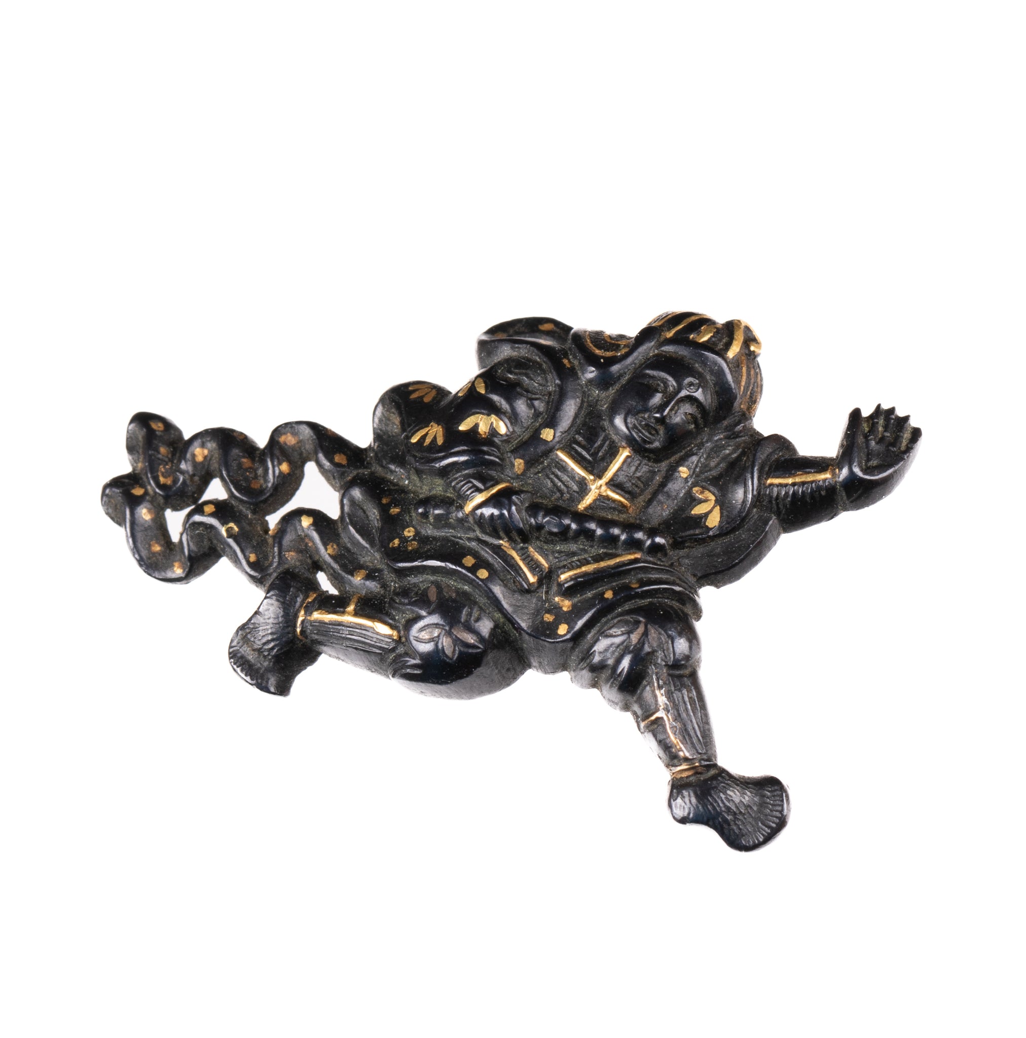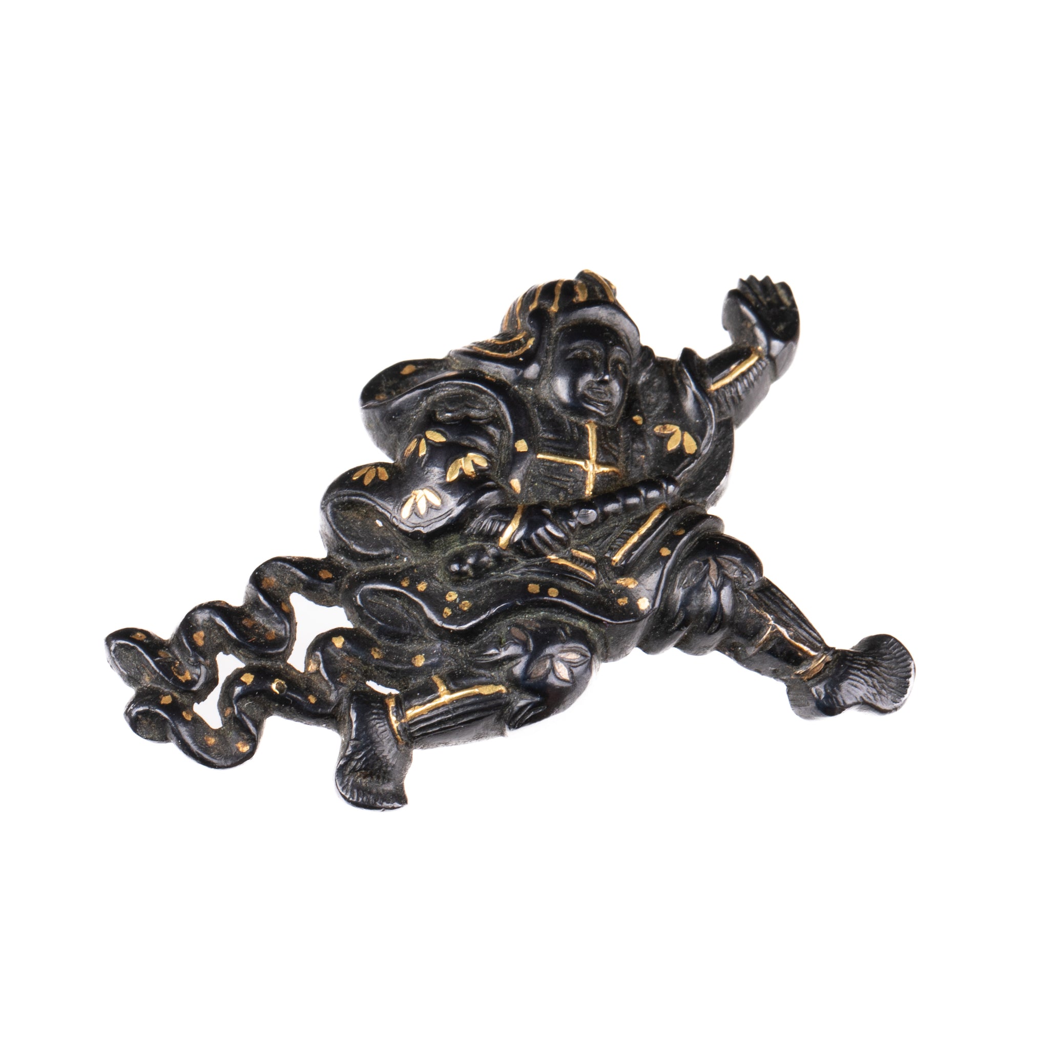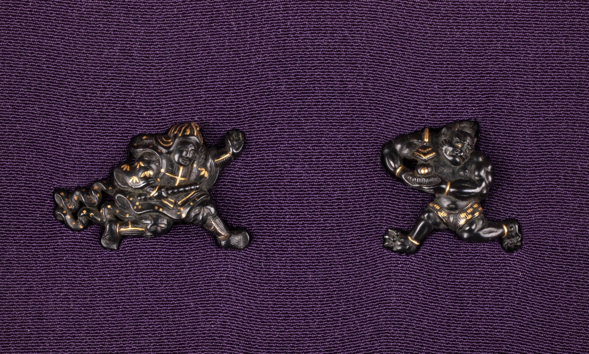 Shakudo menuki attributed to Ko-Kinko tradition with NBTHK Hozon Tosogu. At first glance this attribution by NBTHK seemed a bit strange to me. However after careful study I can't disagree. Carving style and design looks a bit like a mix of early edo Goto and Nara School. They also remind me of sculptures with the difference that on this menuki both Idaten and Demon are moving, while on sculptures they would be still.