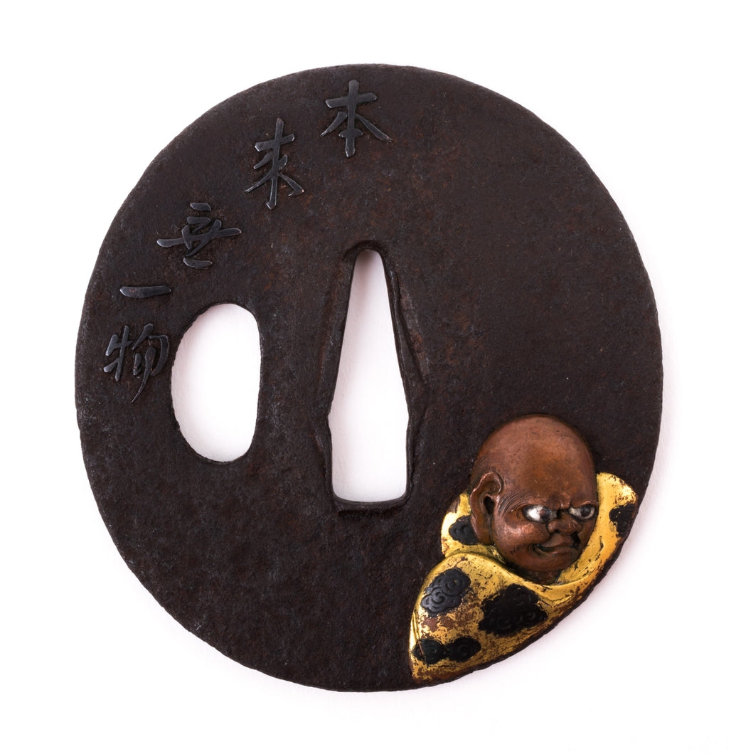 Iron Soten School Tsuba Decorated with Kanzan, Jittoku and Sennin with Tiger
