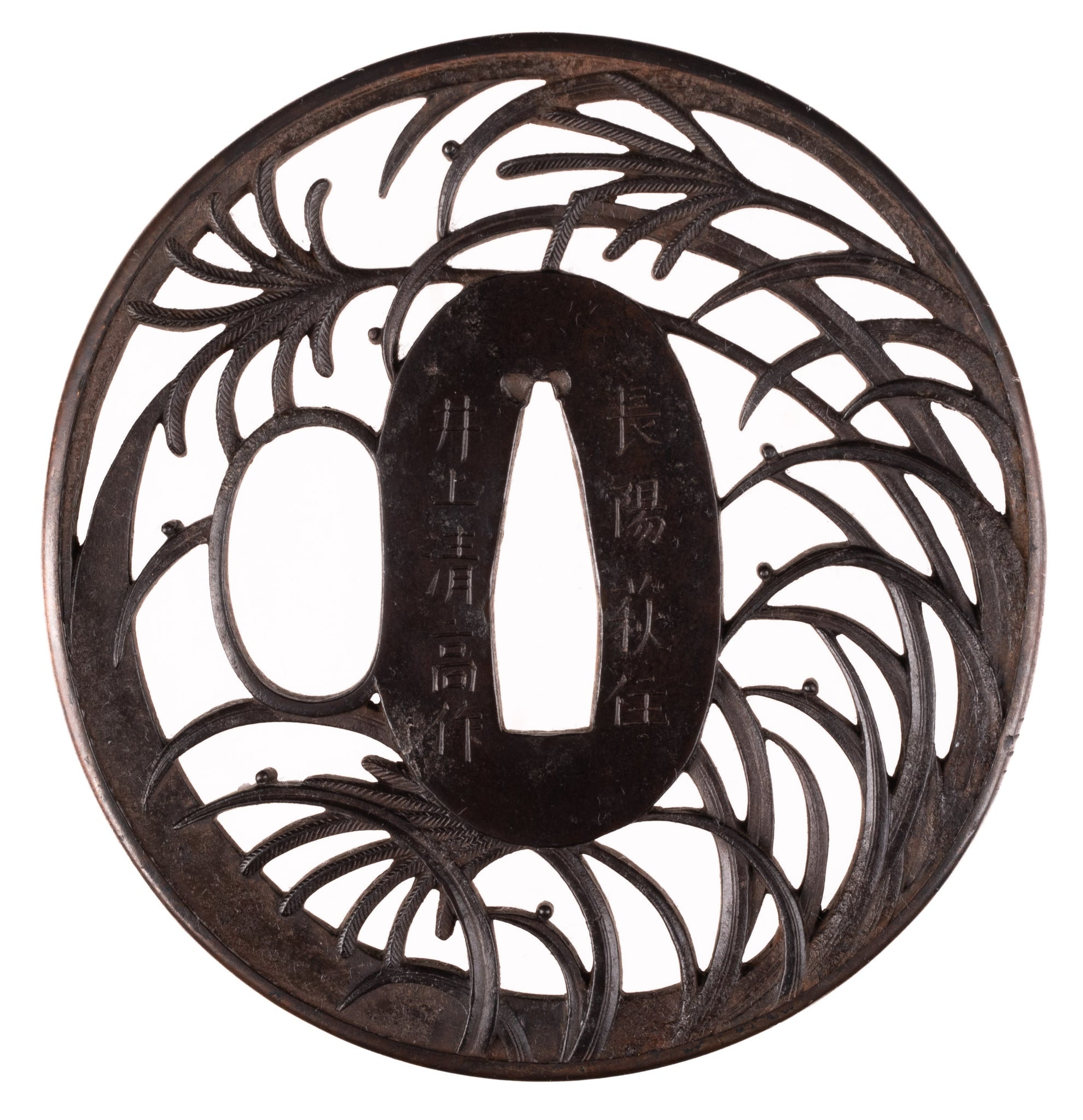 Tsuba Signed "Chōyō Hagi Inoue Kiyotaka". Kiyotaka was a first generation of Choshu Inoue family. Other then that there are not many information about his life. It seems there are information about his employment in 1780. He died on 9 march 1810.