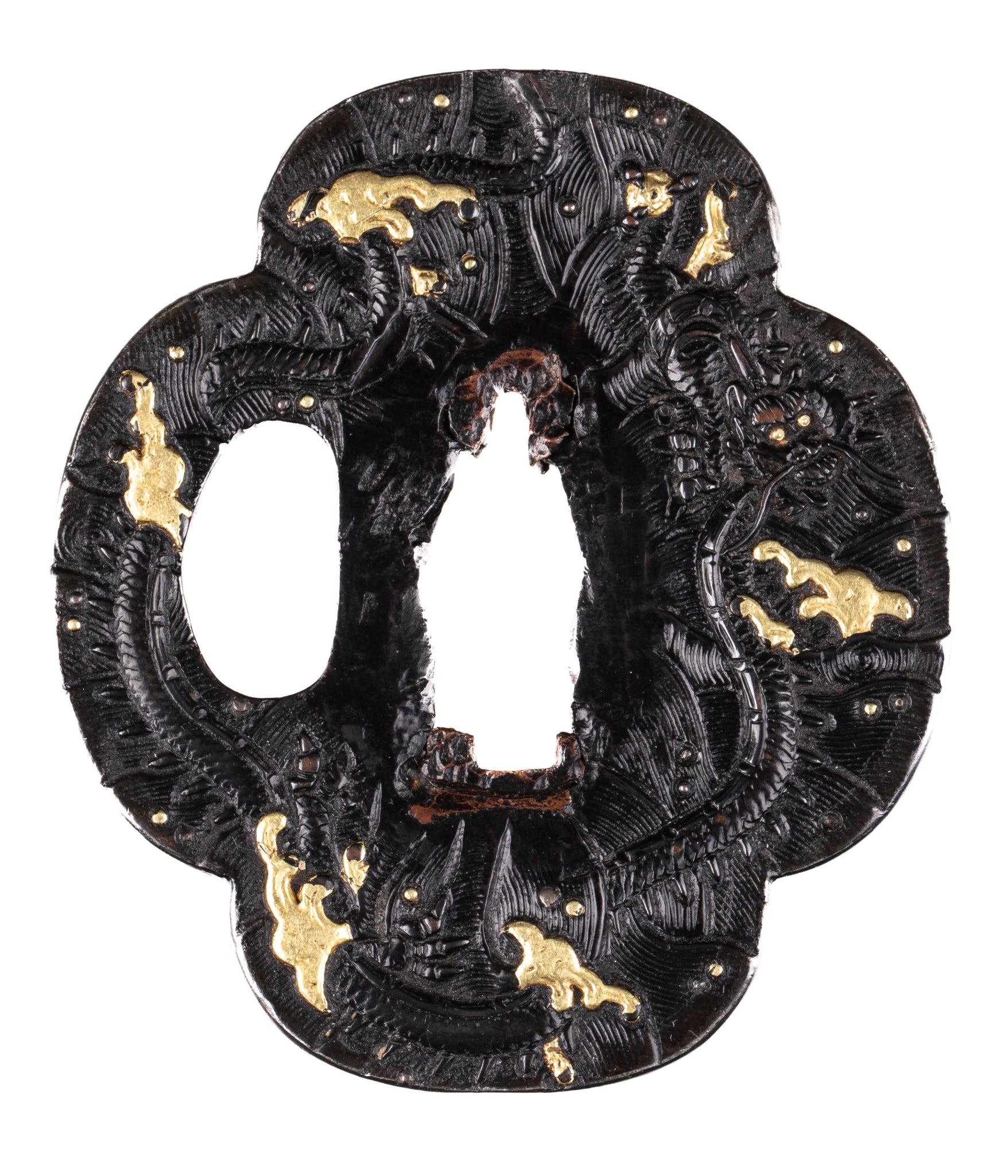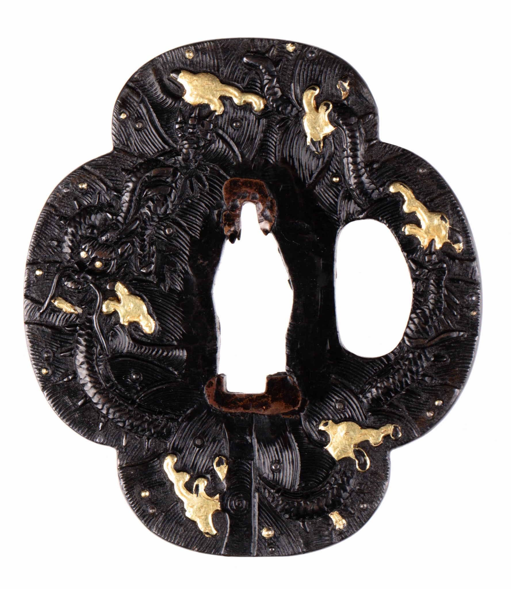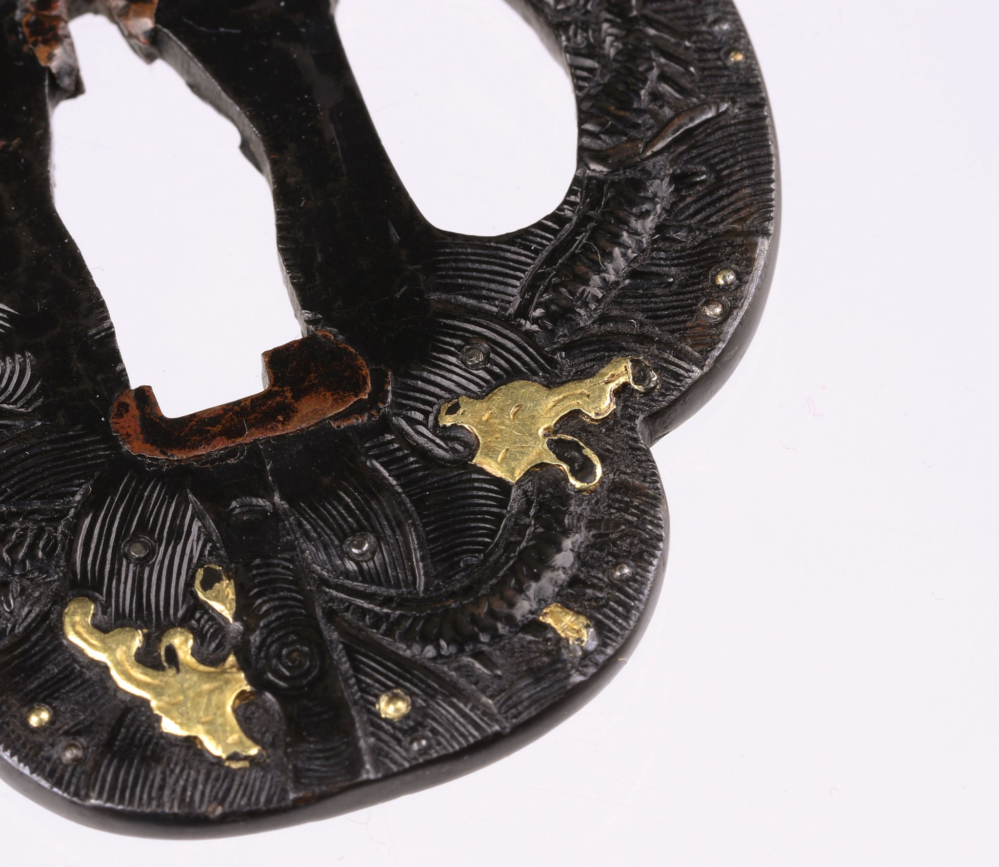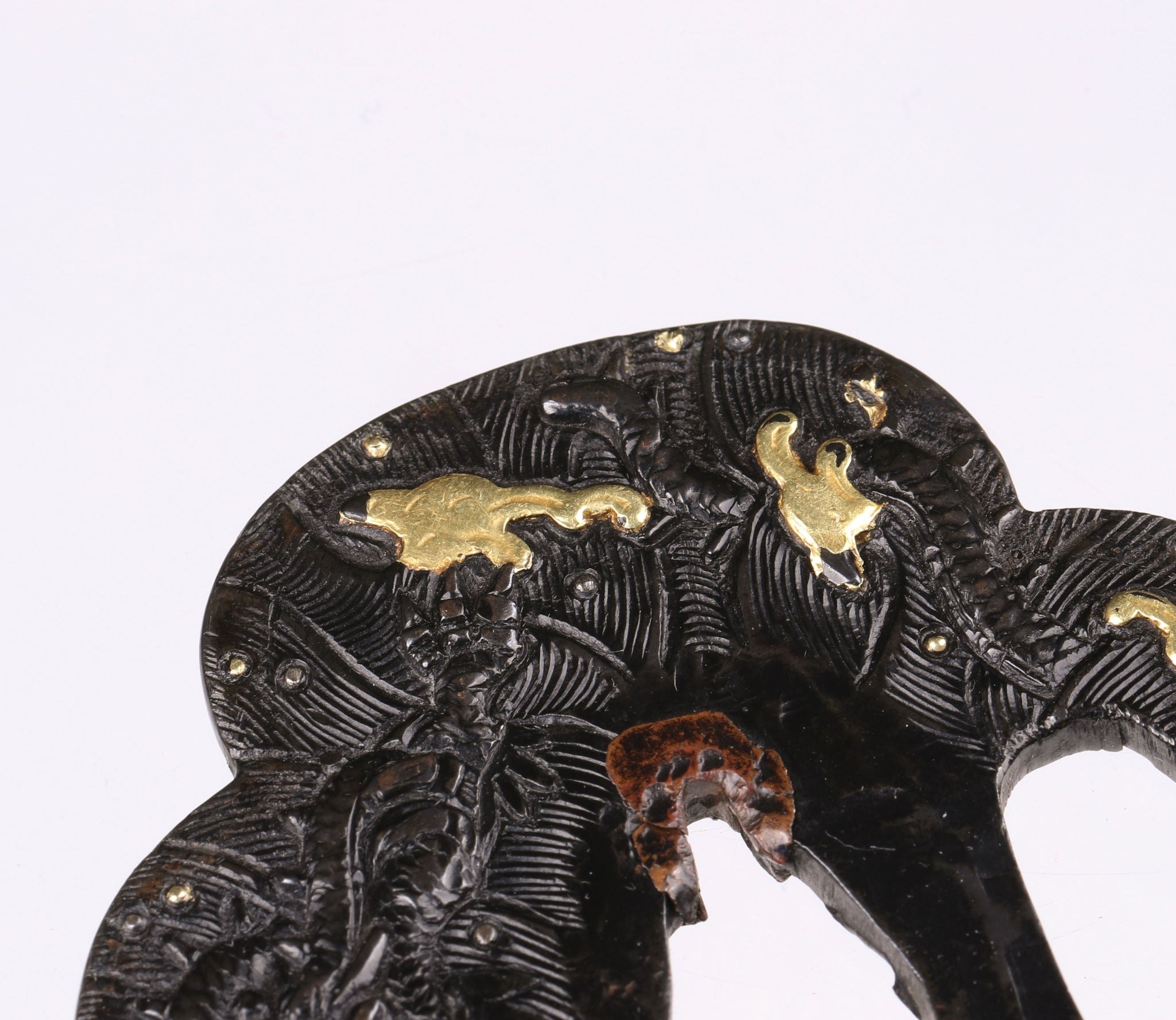 Gold has been applied with an uttori iroe, this technique is rarely seen on tsuba. Iroe was made with gold foil applied on the surface. It is well visible because places where gold was lost are clean and evenly shaped. According to NBTHK there is also zogan iroe here, however I am not sure where.