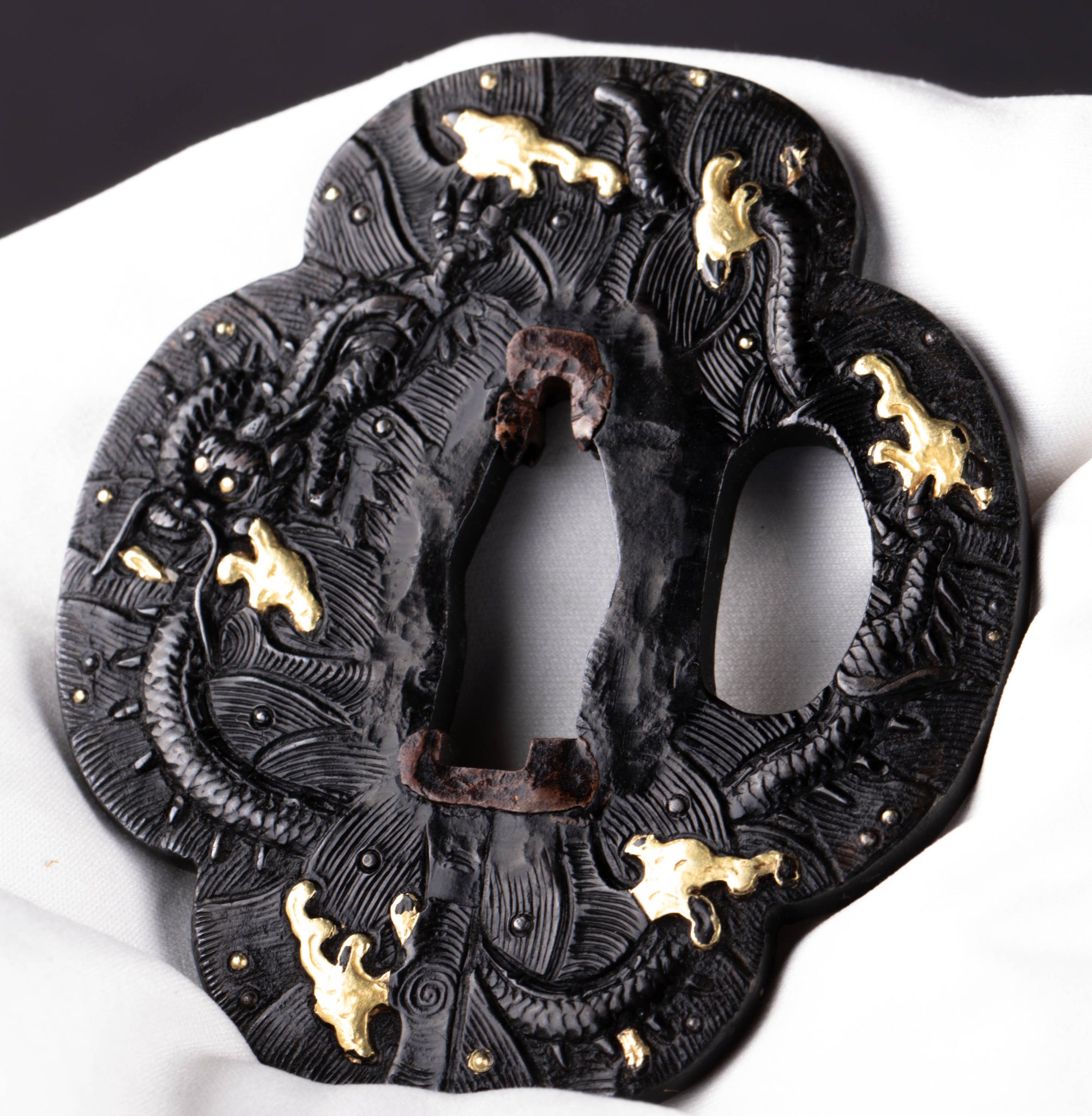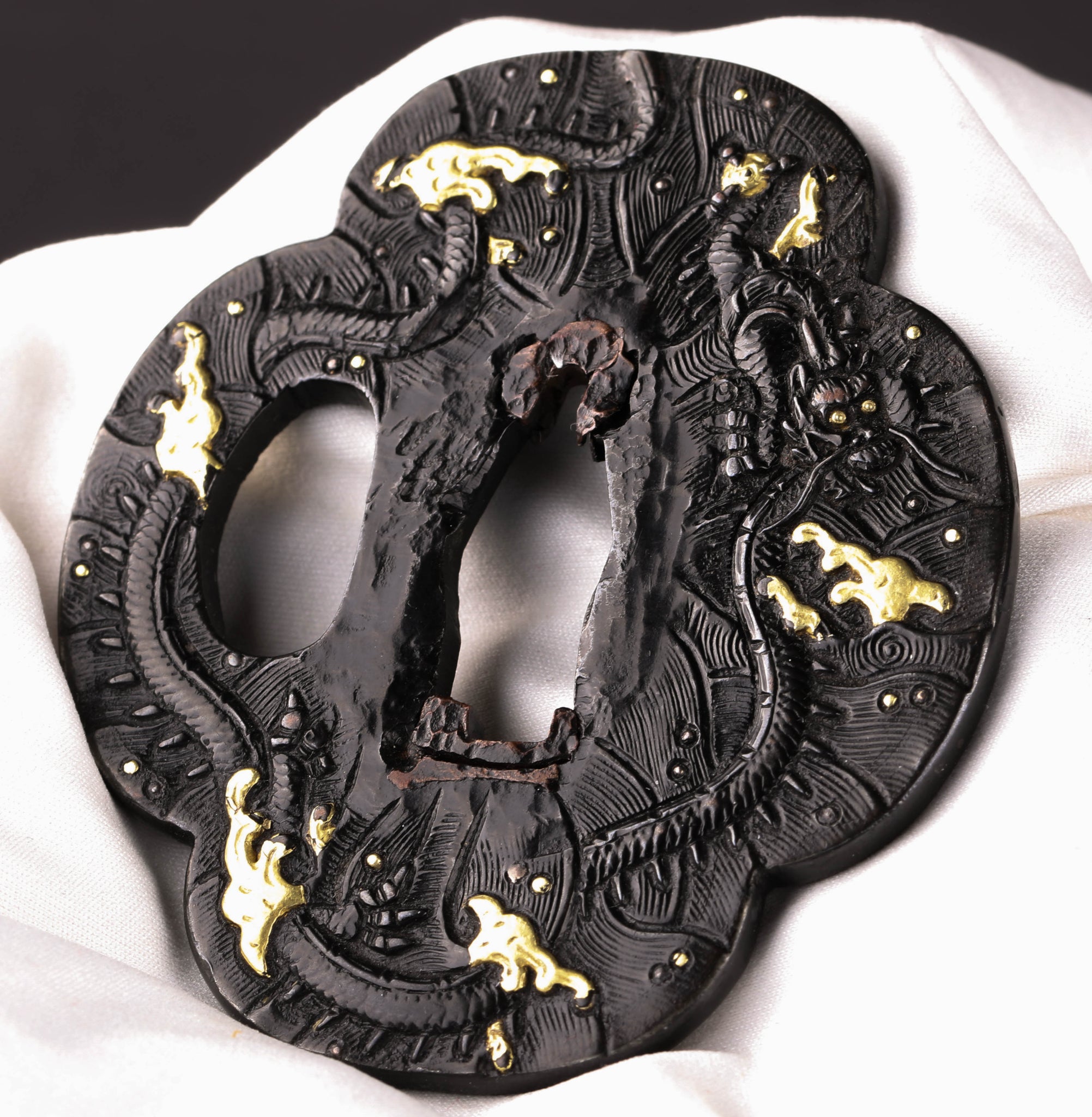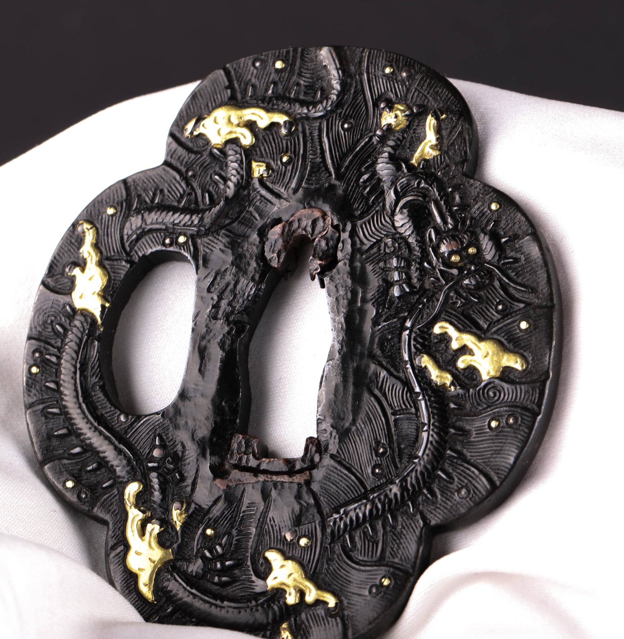 There are some damages to this tsuba including worn out scales of the dragon on the lower part of the front. It is something we sometimes see on old kinko kozuka. This tsuba must have been used a lot to have a damage like that.