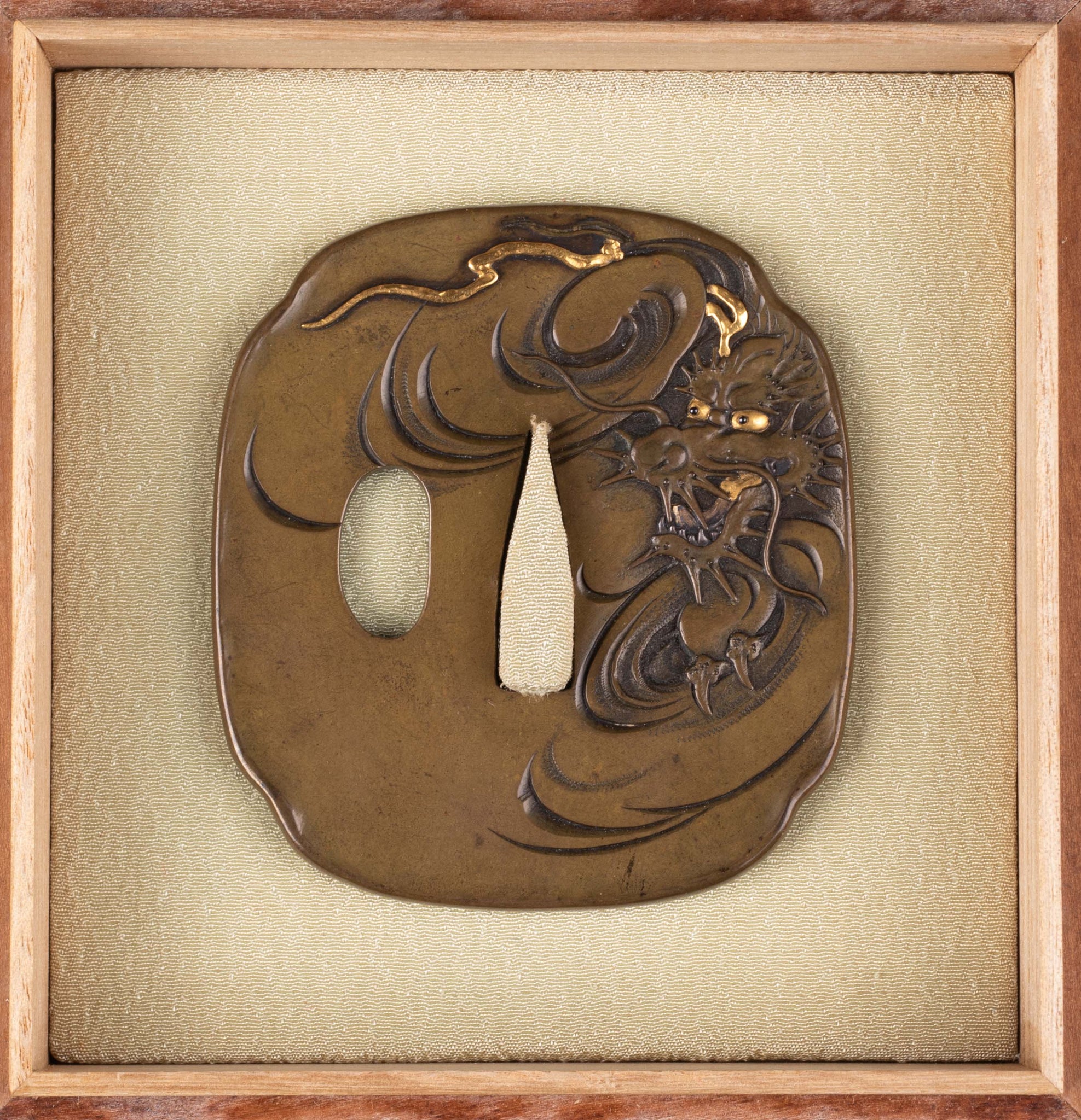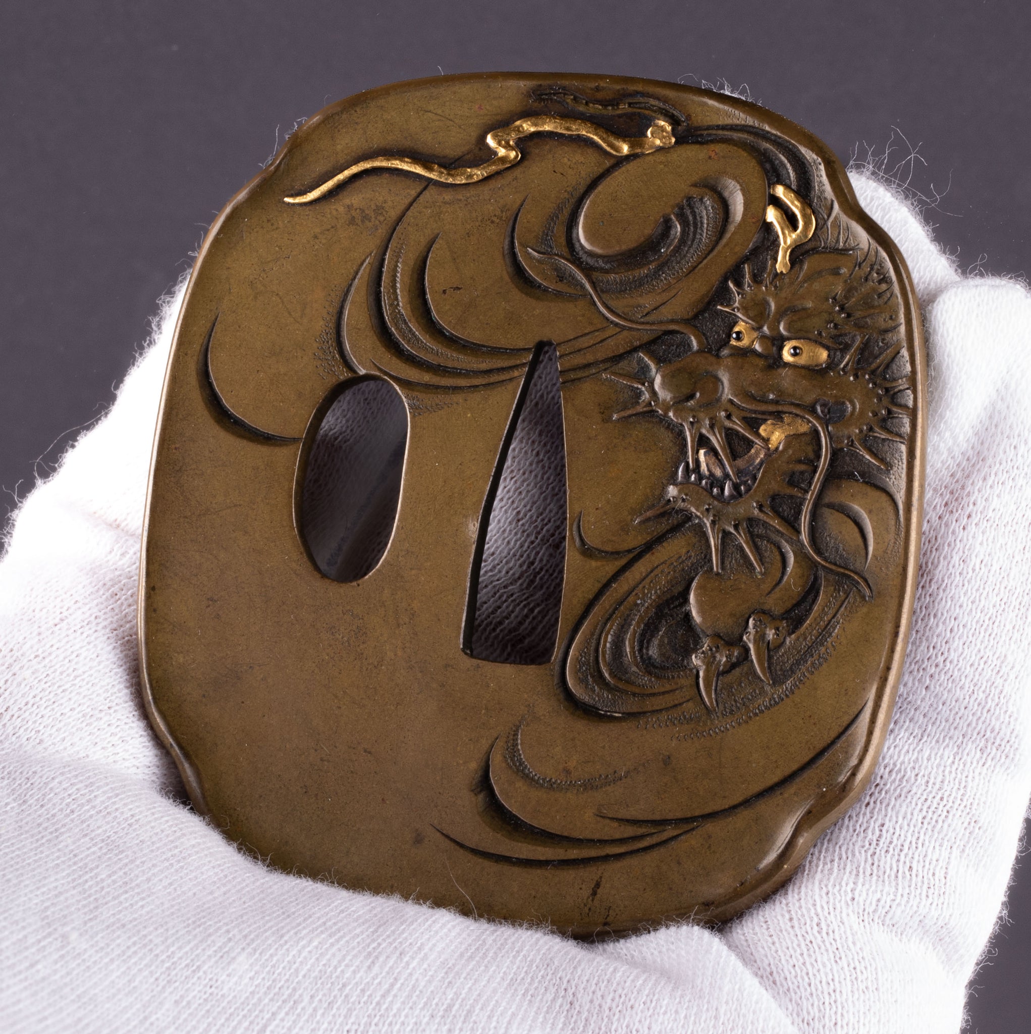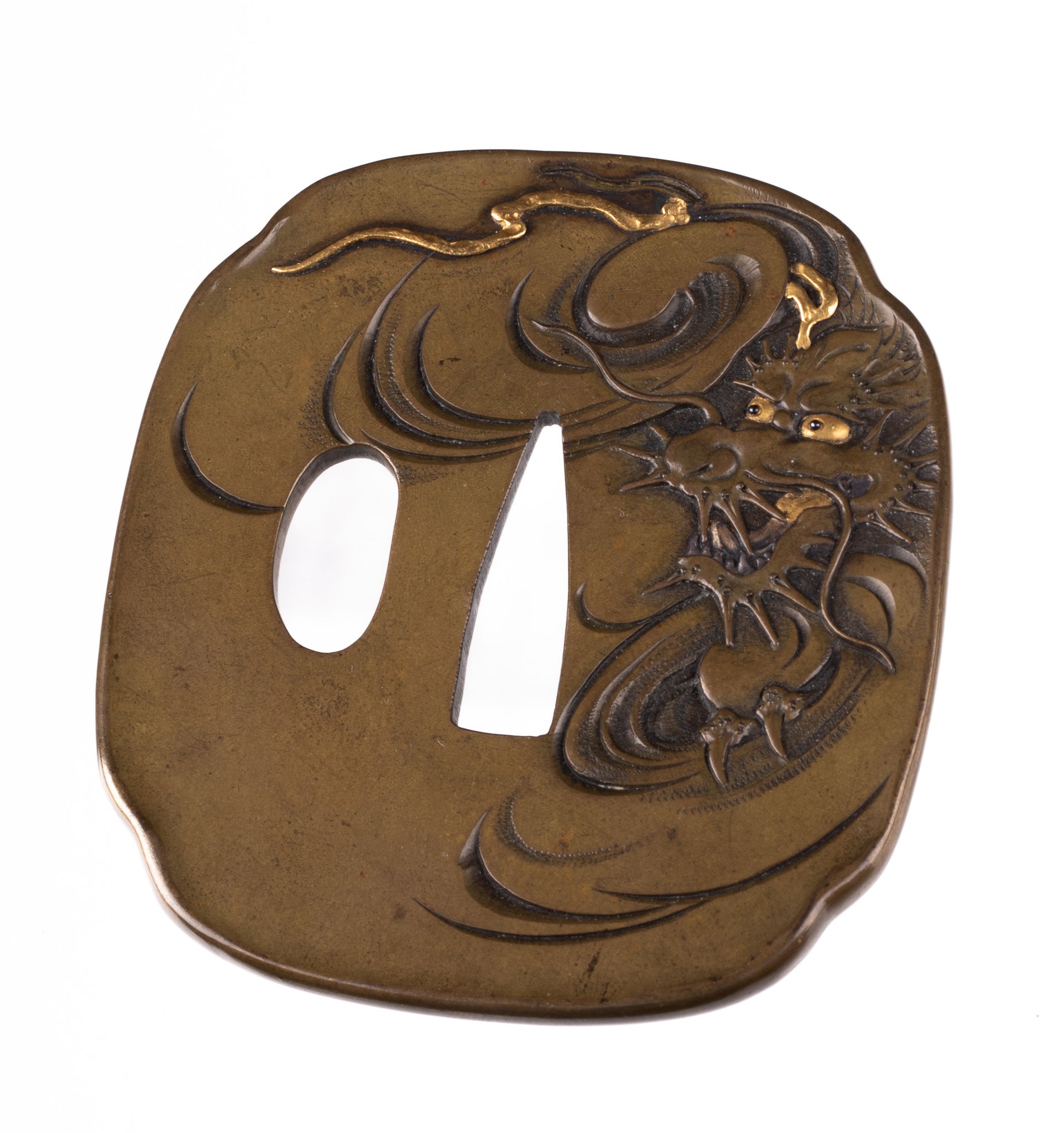Shinchu tsuba decorated with a dragon. It is made in an Otsuki School style. Most probably in Meiji period but could be very late Edo.