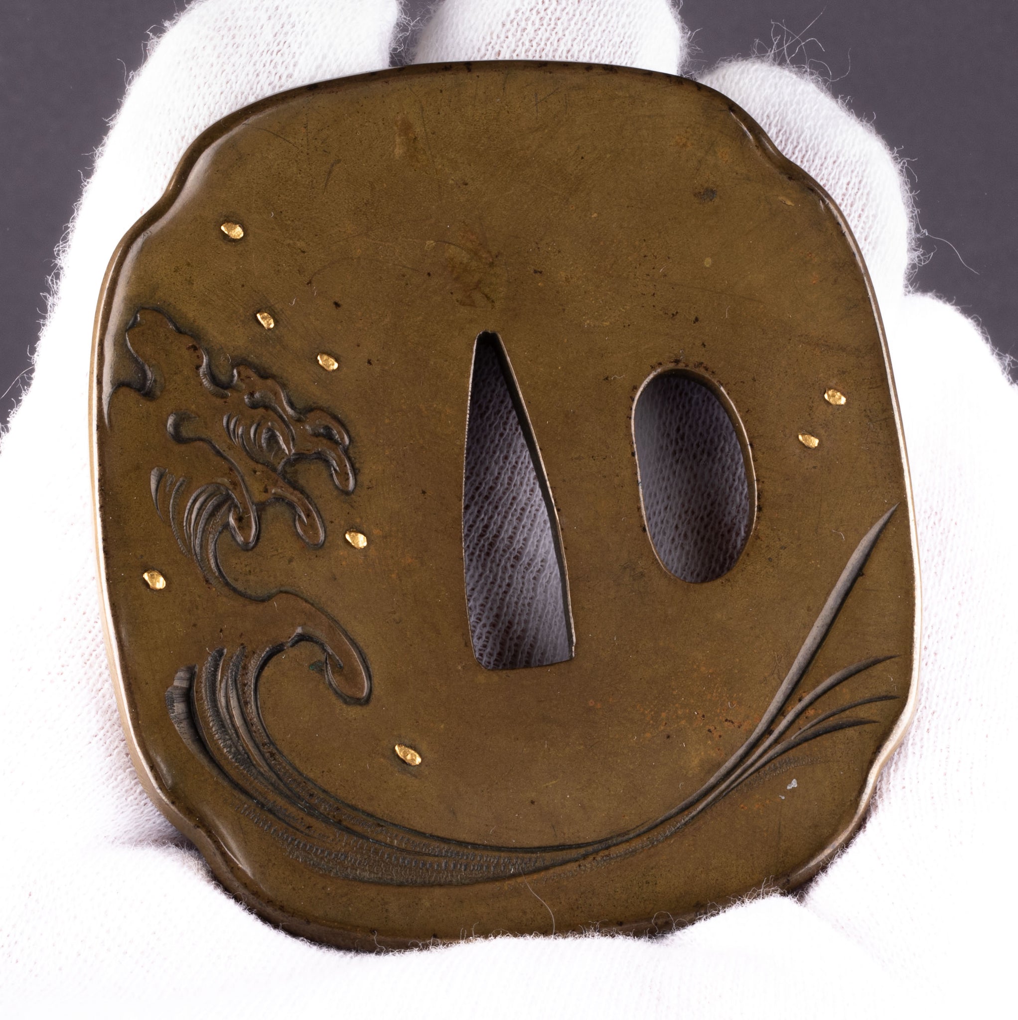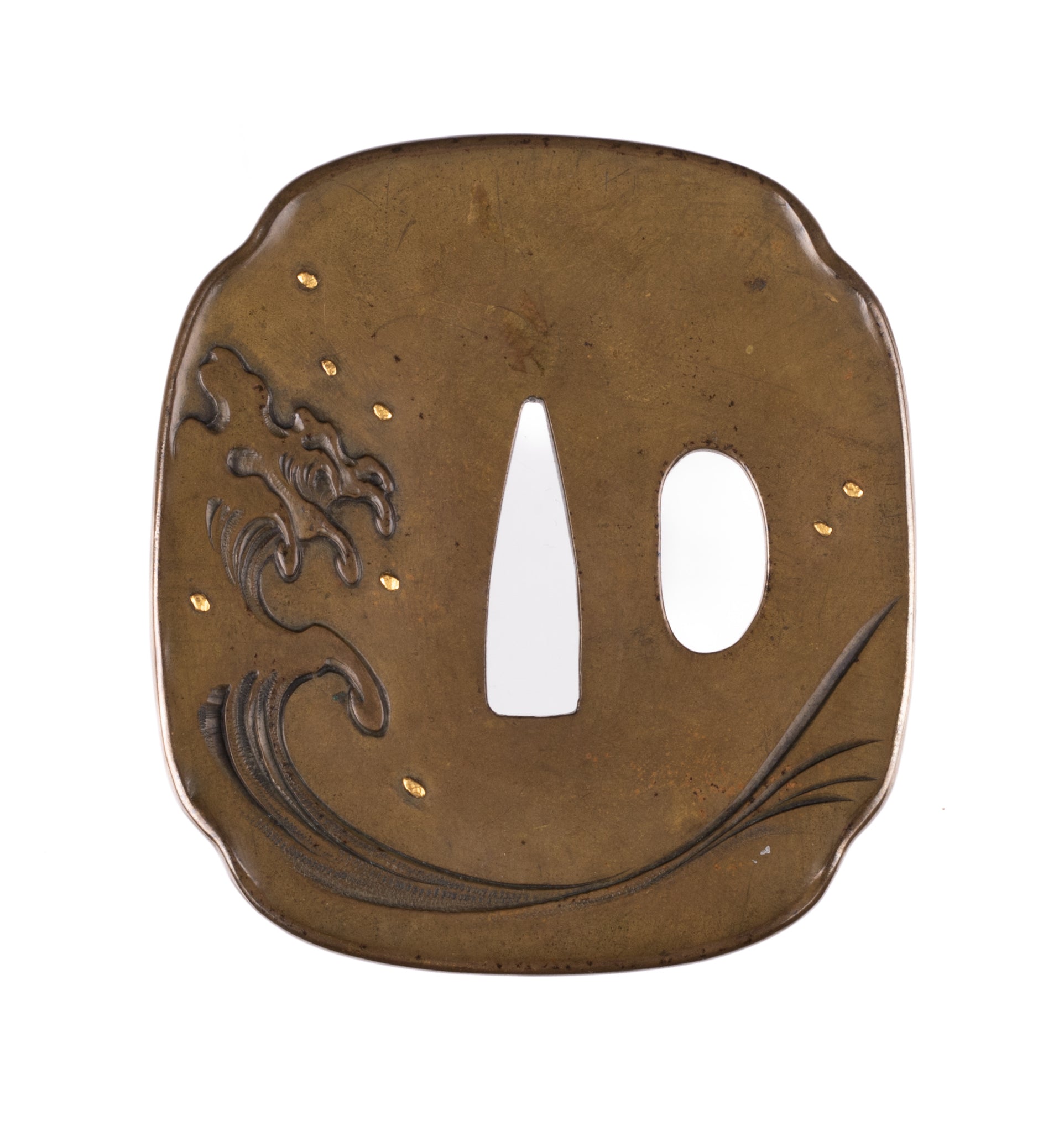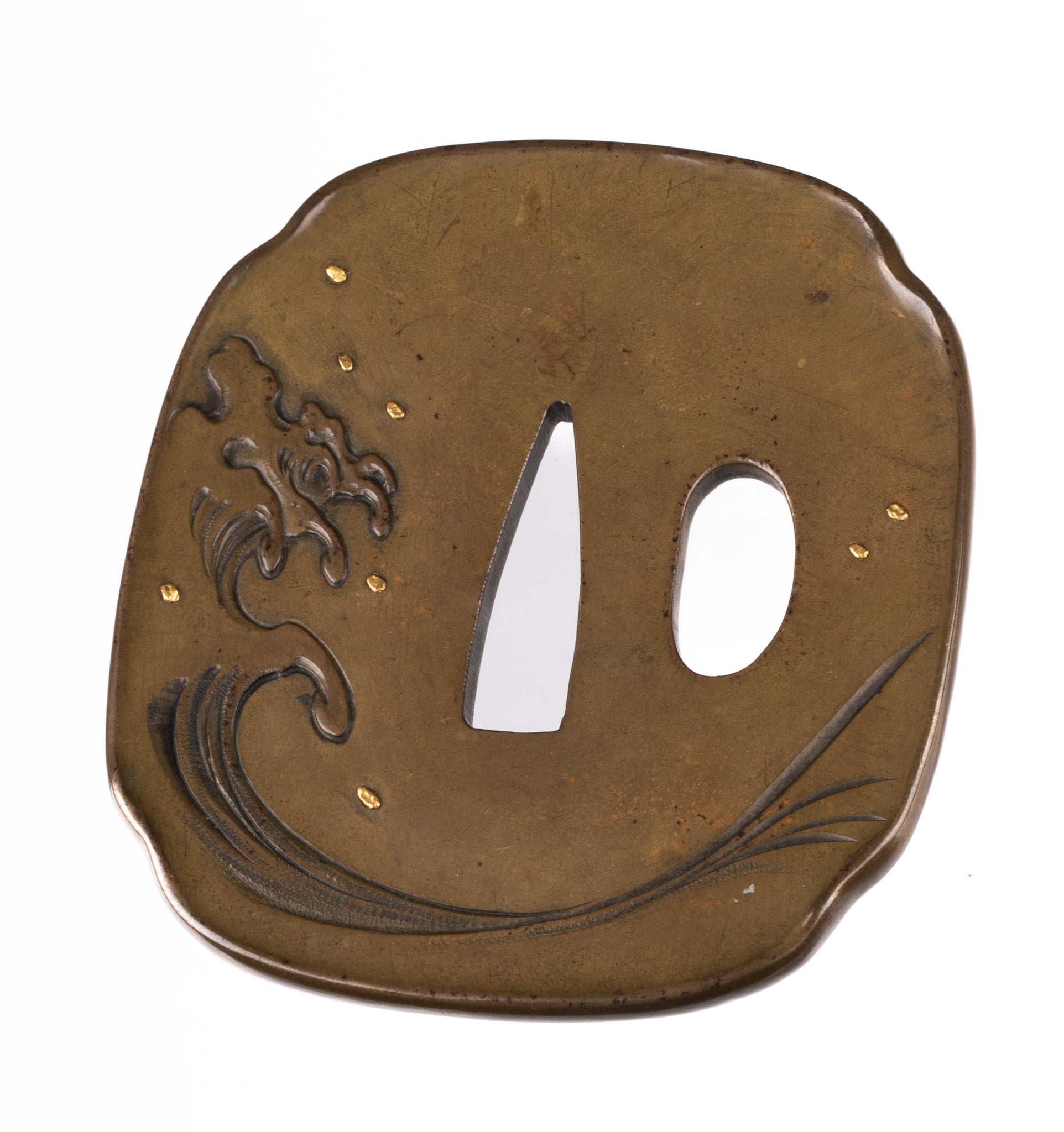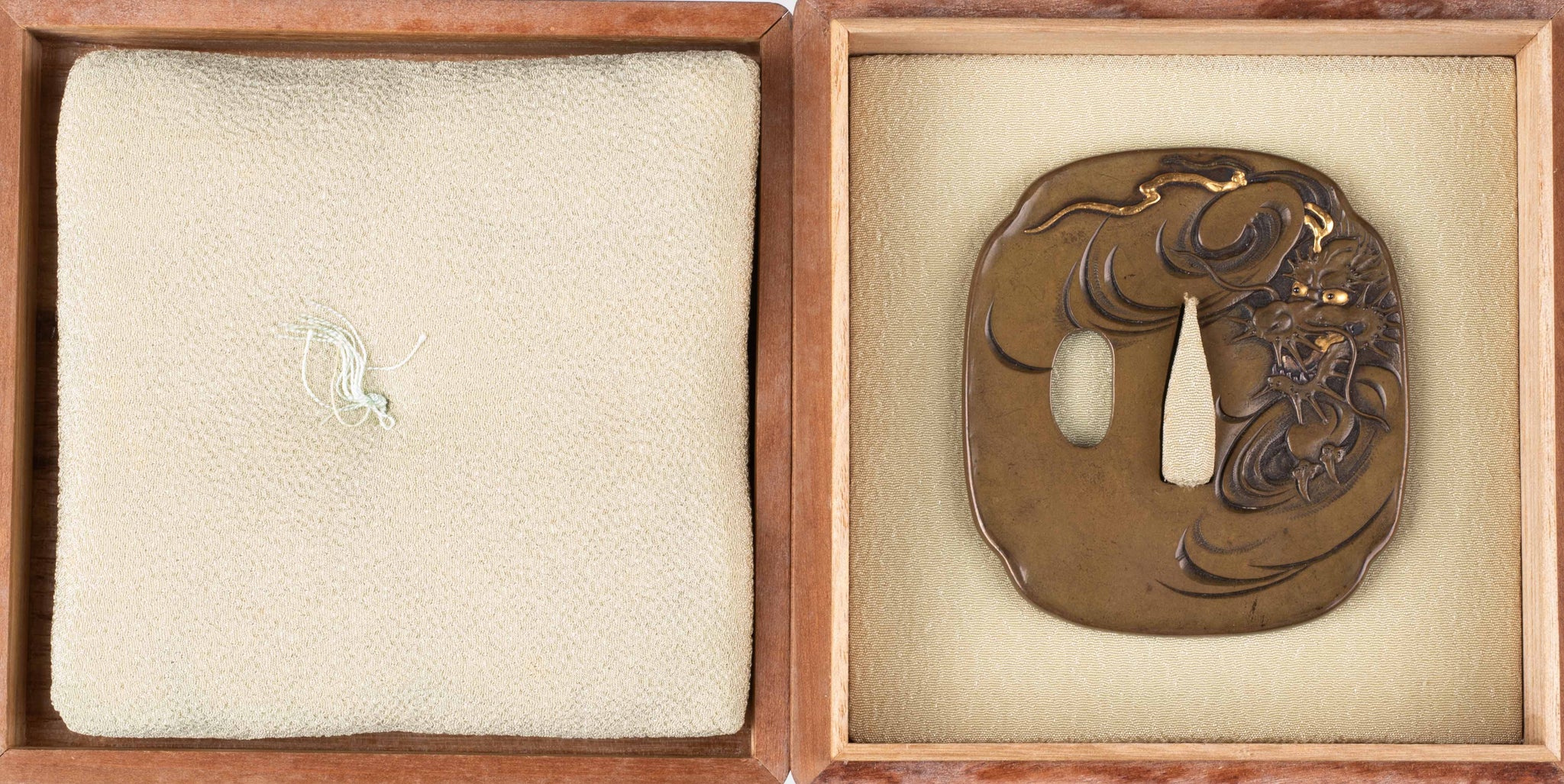 Shinchu tsuba decorated with a dragon. It is made in an Otsuki School style. Most probably in Meiji period but could be very late Edo.