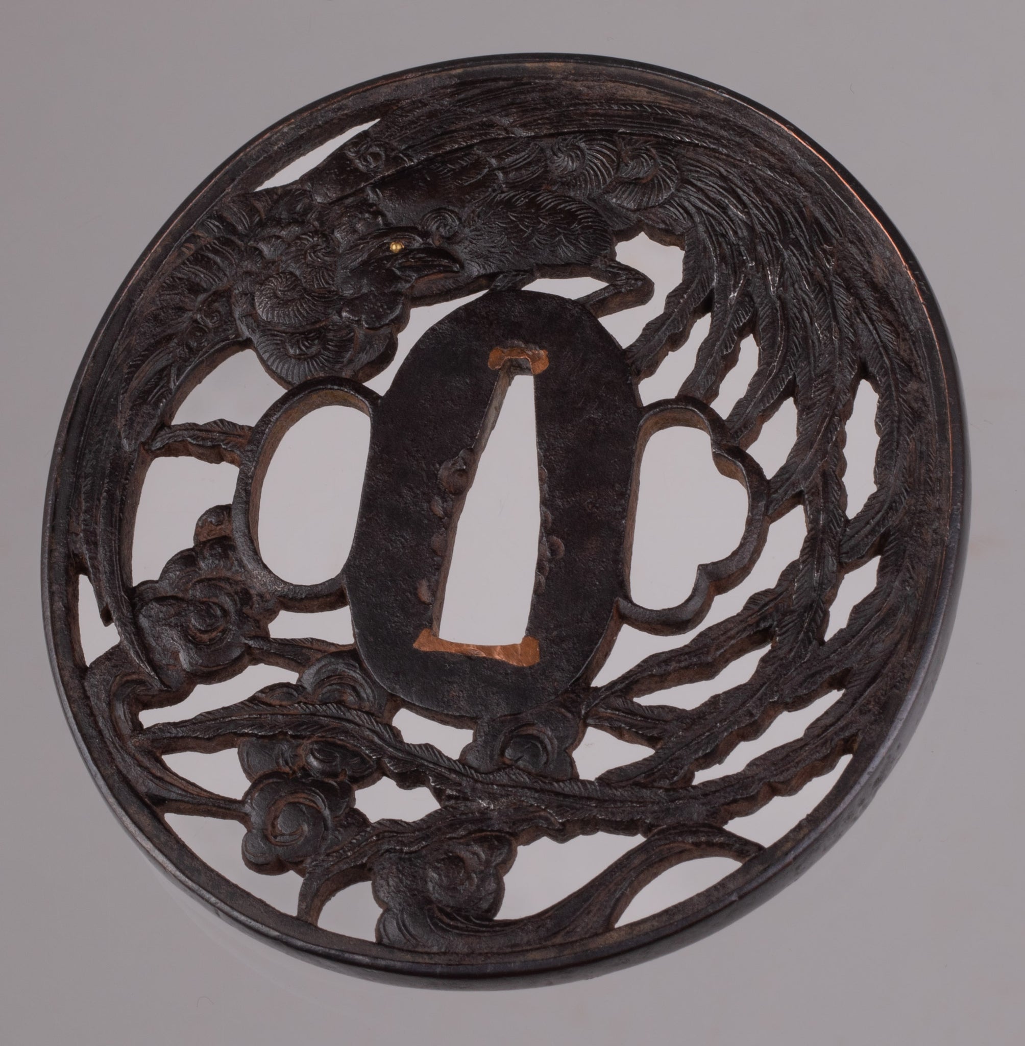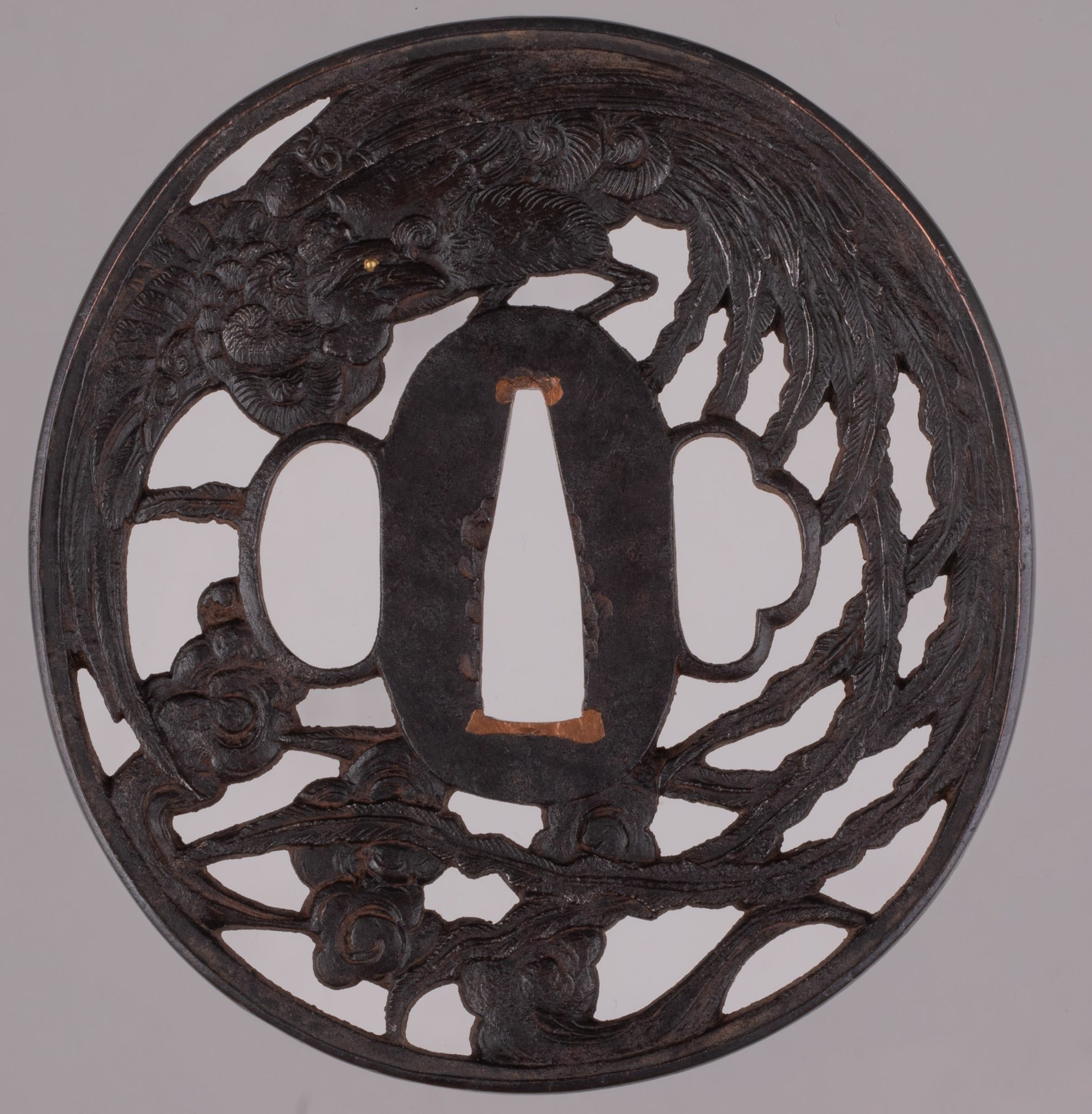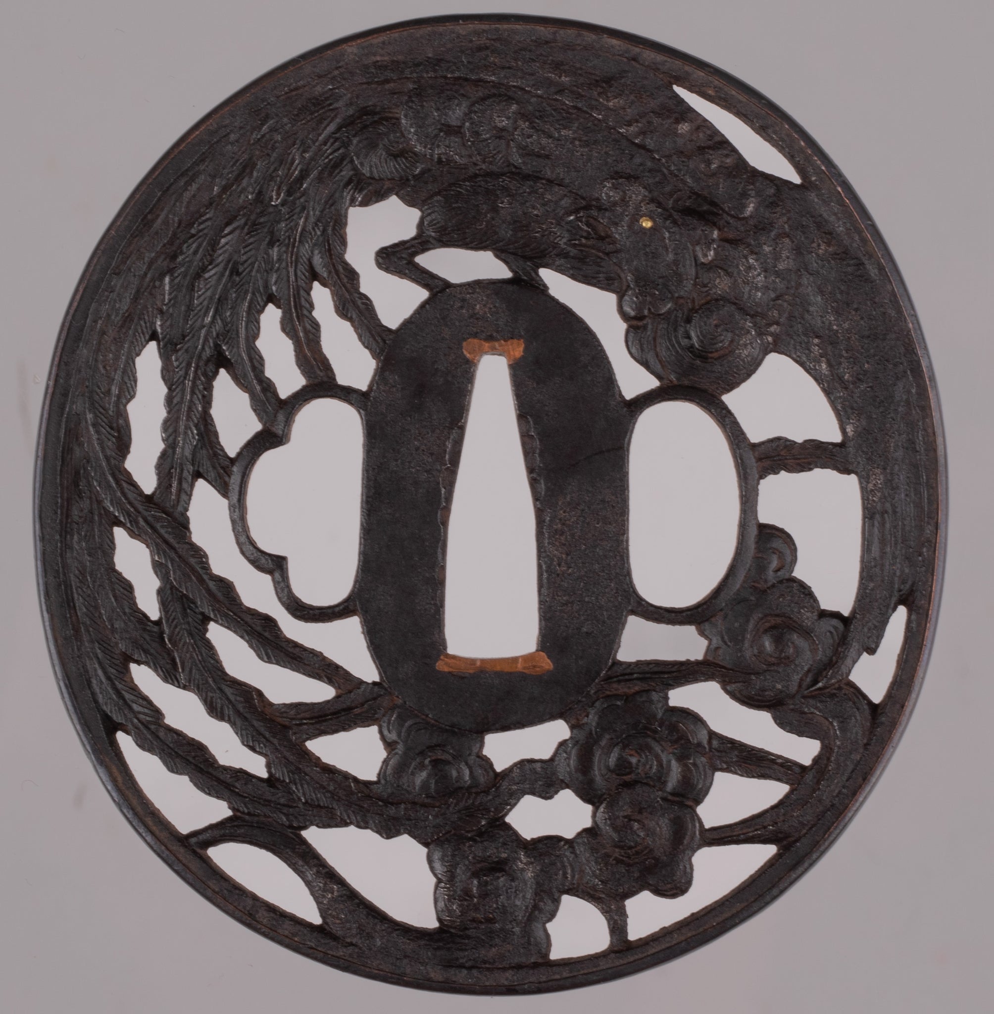 Iron sukashi tsuba decorated with the phoenix. It is a really beautiful design and good execution. Unfortunately the condition on the reverse is not that good.