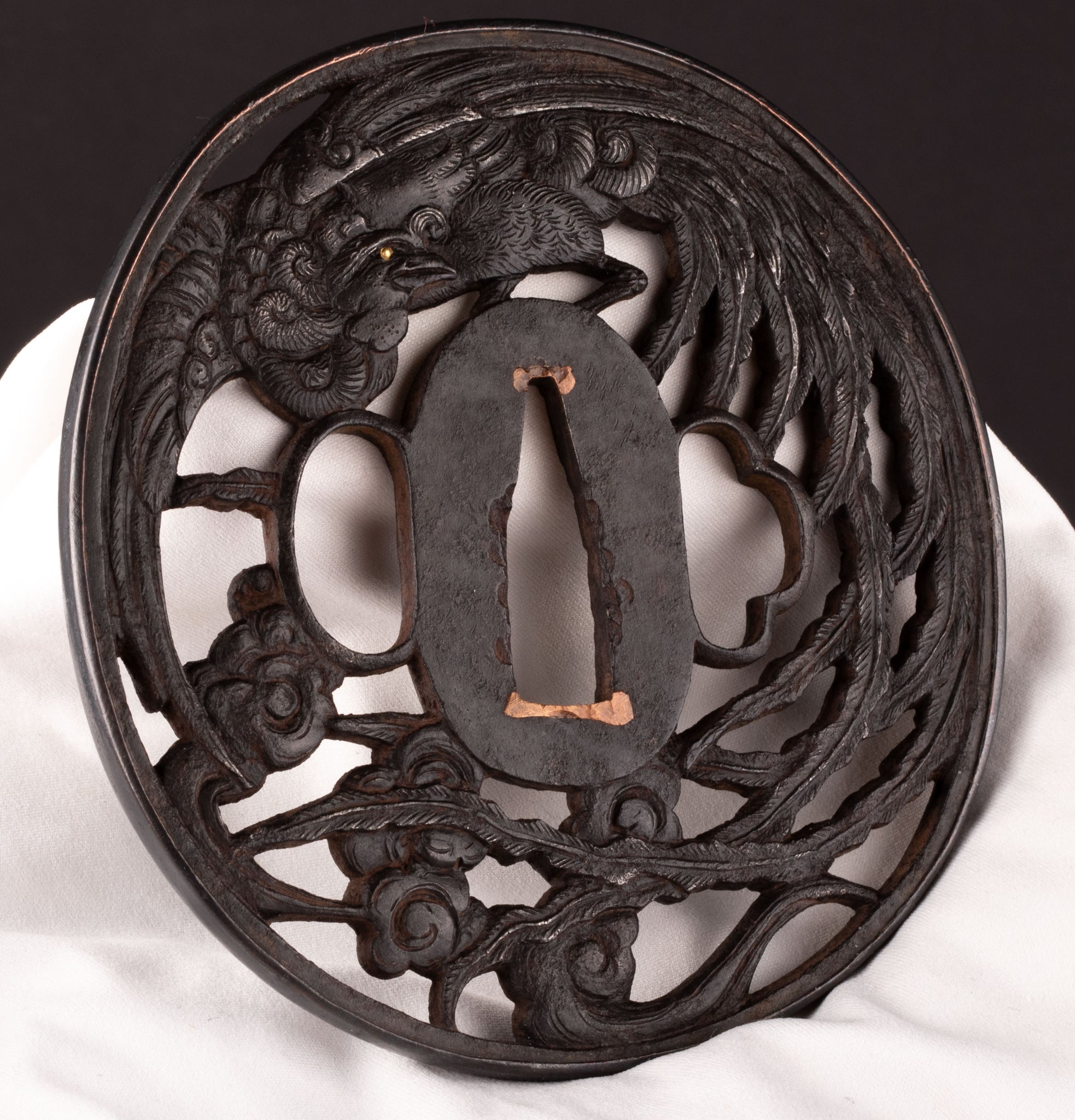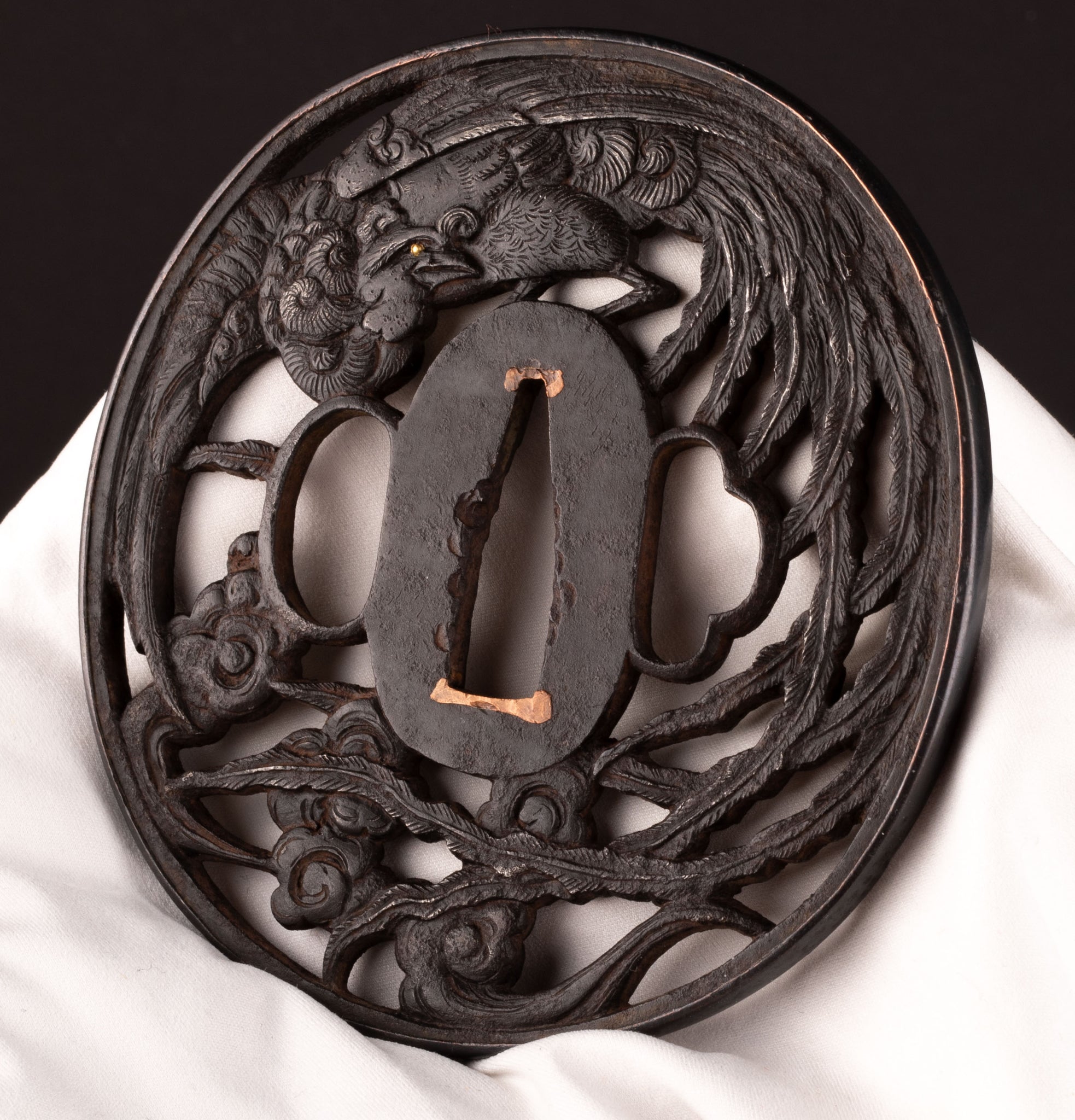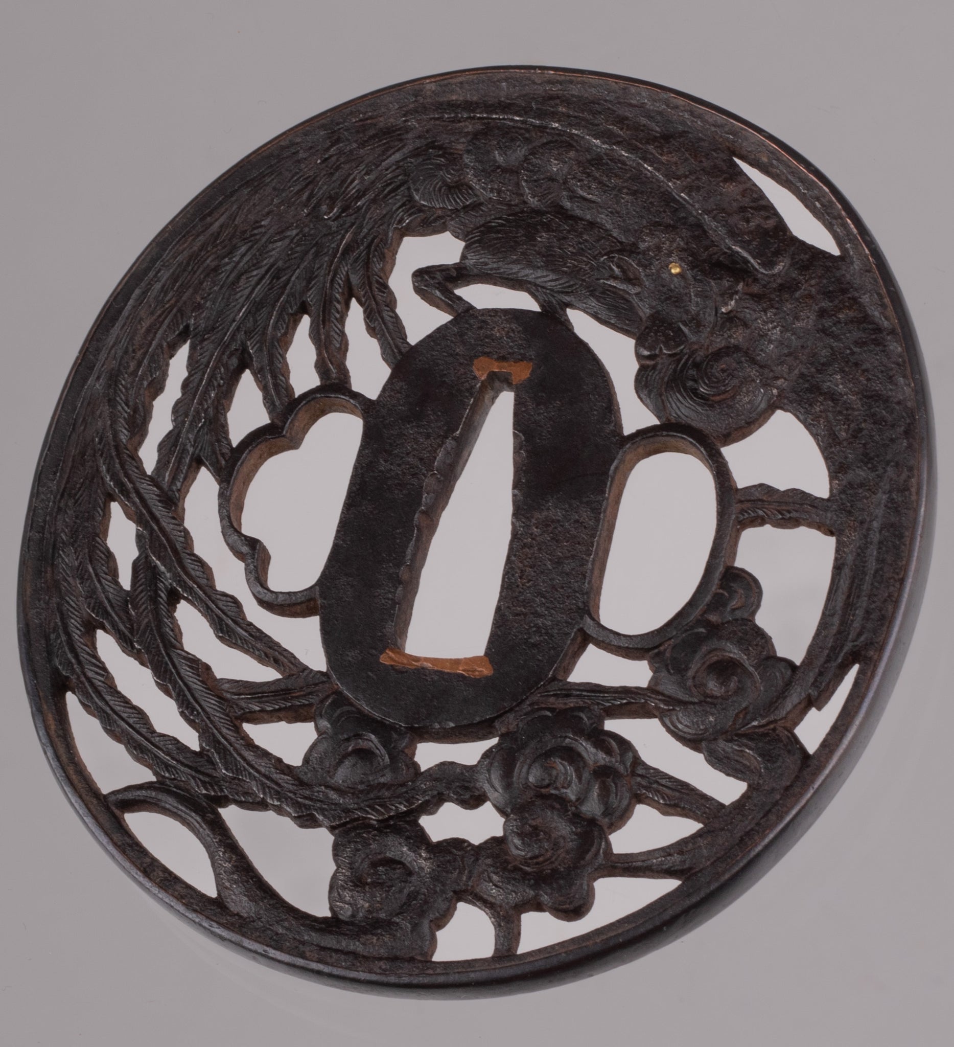Iron sukashi tsuba decorated with the phoenix. It is a really beautiful design and good execution. Unfortunately the condition on the reverse is not that good.
